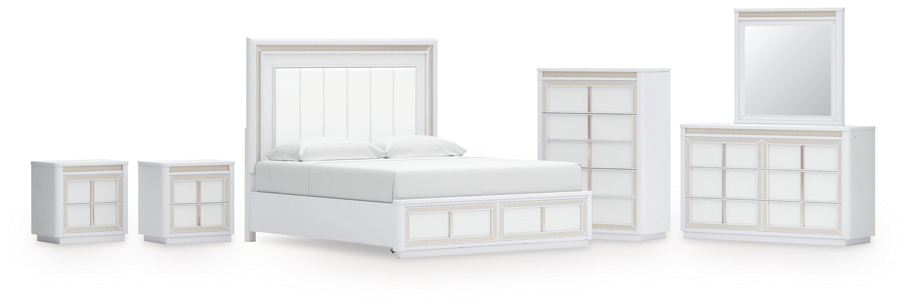Chalanna King Upholstered Storage Bed with Mirrored Dresser, Chest and 2 Nightstands in White