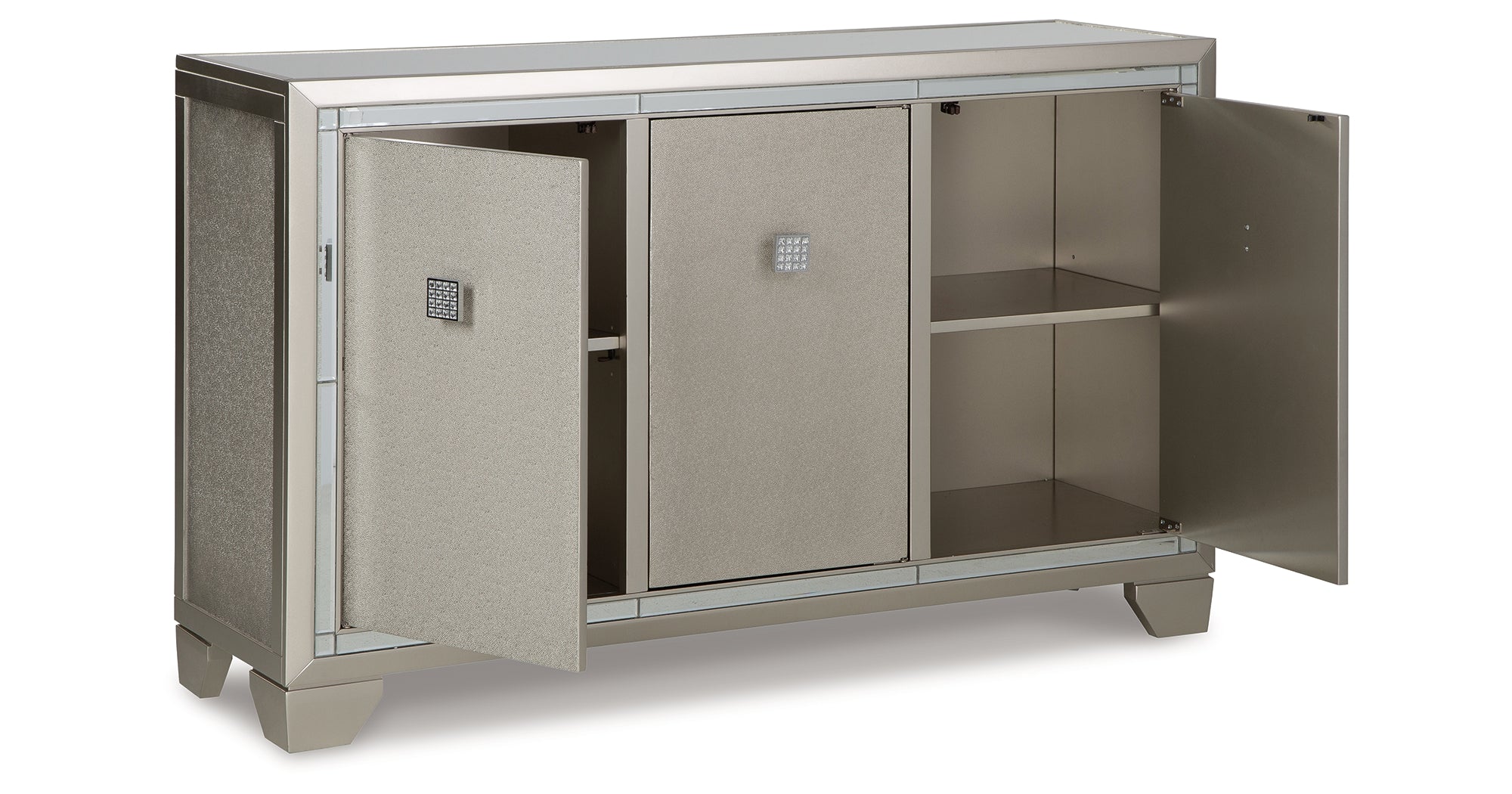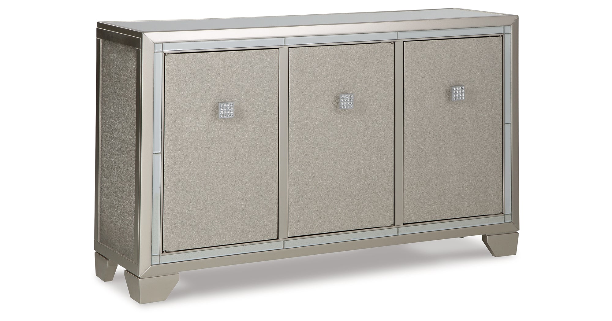 Reflect your love for contemporary style with this accent cabinet. It features a mirrored top and beveled mirror accents, adding both light and a touch of glam to your space. Decorated with faux crystal and chrome-tone pulls, the textured silvertone door fronts open to reveal adjustable shelving to meet all your storage needs. — Luna Furniture introduces Chaseton Accent Cabinet to enhance the beauty of your living spaces.