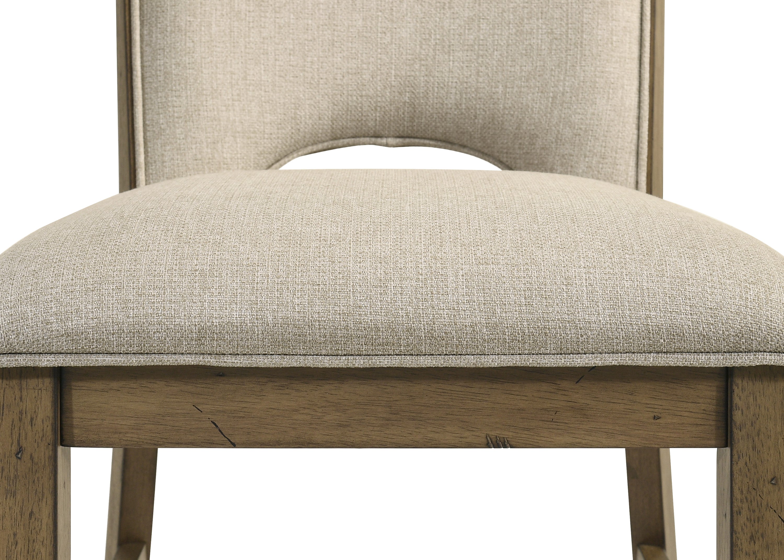 • Soft Upholstered Seating: Neutral beige chairs and bench are upholstered in chenille fabric, offering plush comfort and a refined look.