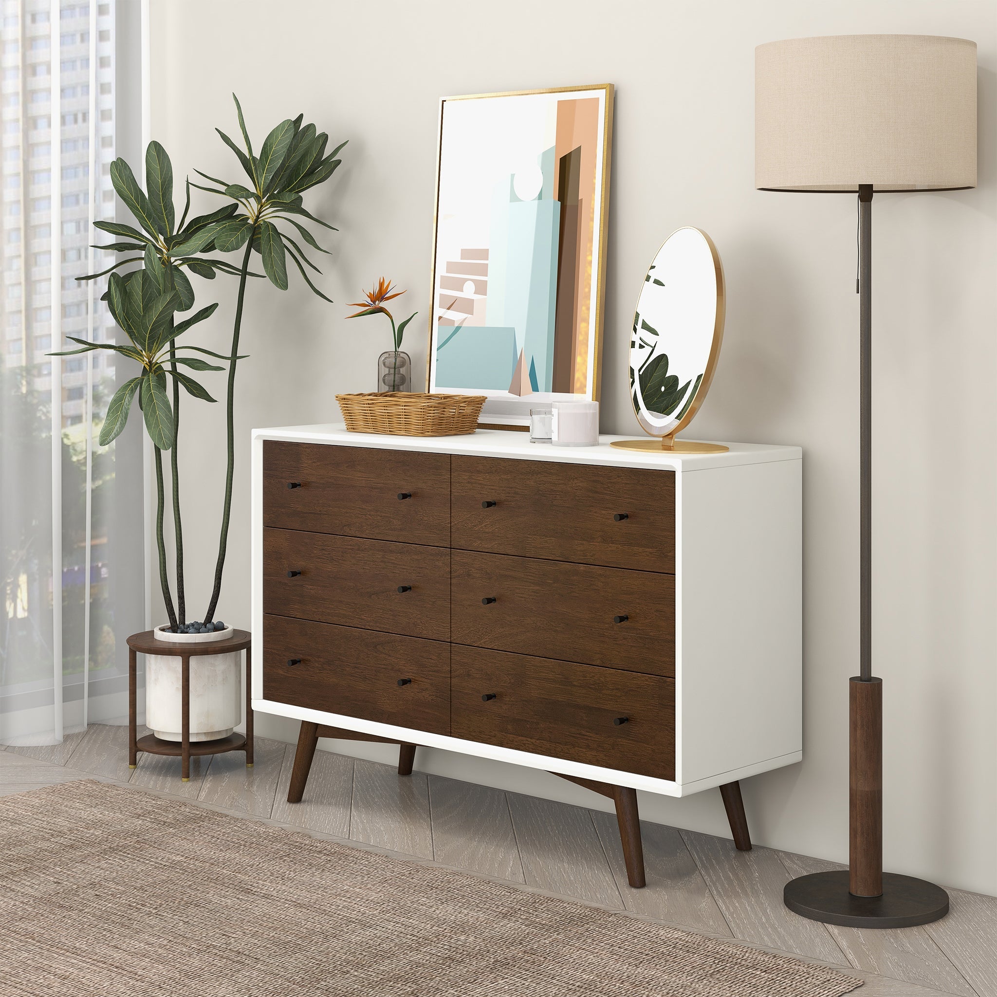 Complete your urban home bedroom furniture decor with these stylish mid-century modern six-drawers,. It's not and only closet storage important addition to any stylish bedroom furniture set. This modern bedroom dresser offers six spacious drawers that open and close smoothly, with sliders as drawer organizers. Its spacious drawers are perfect for storing easy bulky clothes to help you tide up all bedroom clusters. This aesthetic front solid wood drawer of closet organizer's flat top surface is suitable for your electronics, books, and lamp. Elevation of your bedroom set starts with this contemporary clothes organizer console table. This chest of drawers can be a massive addition to storage space in the master bedroom, guest room, kids' room, entryway, dining room, game room, and all living spaces!