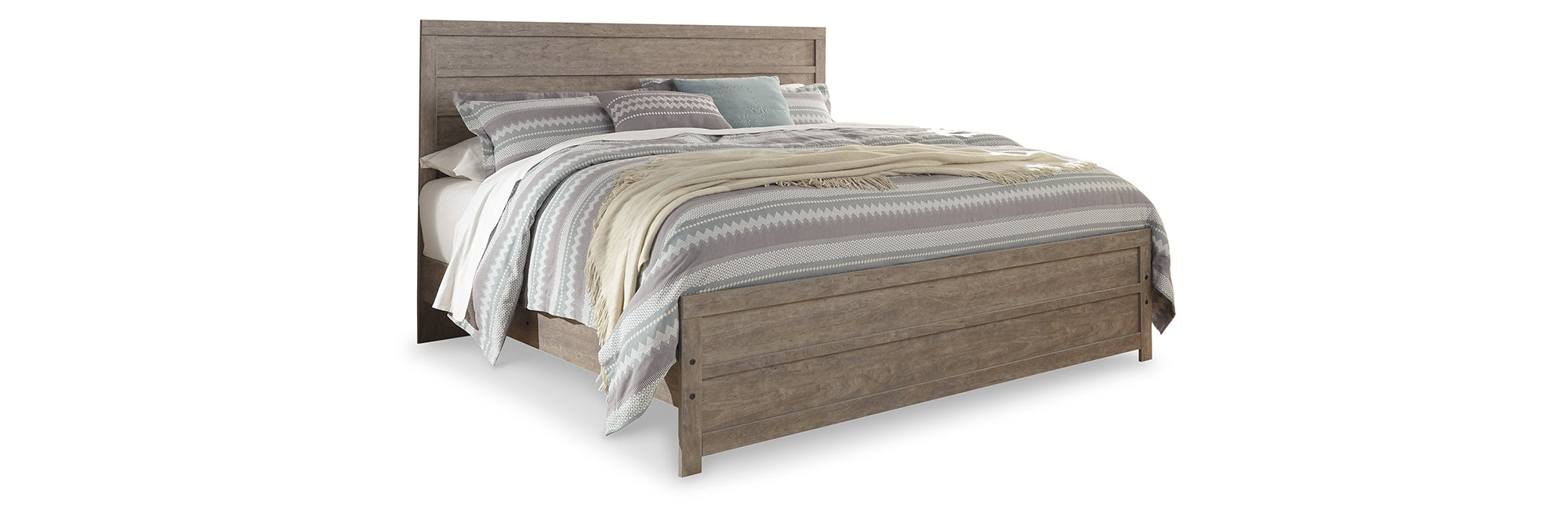 This king panel bed’s weathered driftwood finish evokes such an ethereal vibe—exactly what you need for a serene bedroom suite. Chunky moulding creates a plank-like effect while clean lines make for a timeless look you’ll love living with for years to come. Mattress and foundation/box spring available, sold separately. Luna Furniture introduces Culverbach King Panel Bed to enhance the beauty of your living spaces.