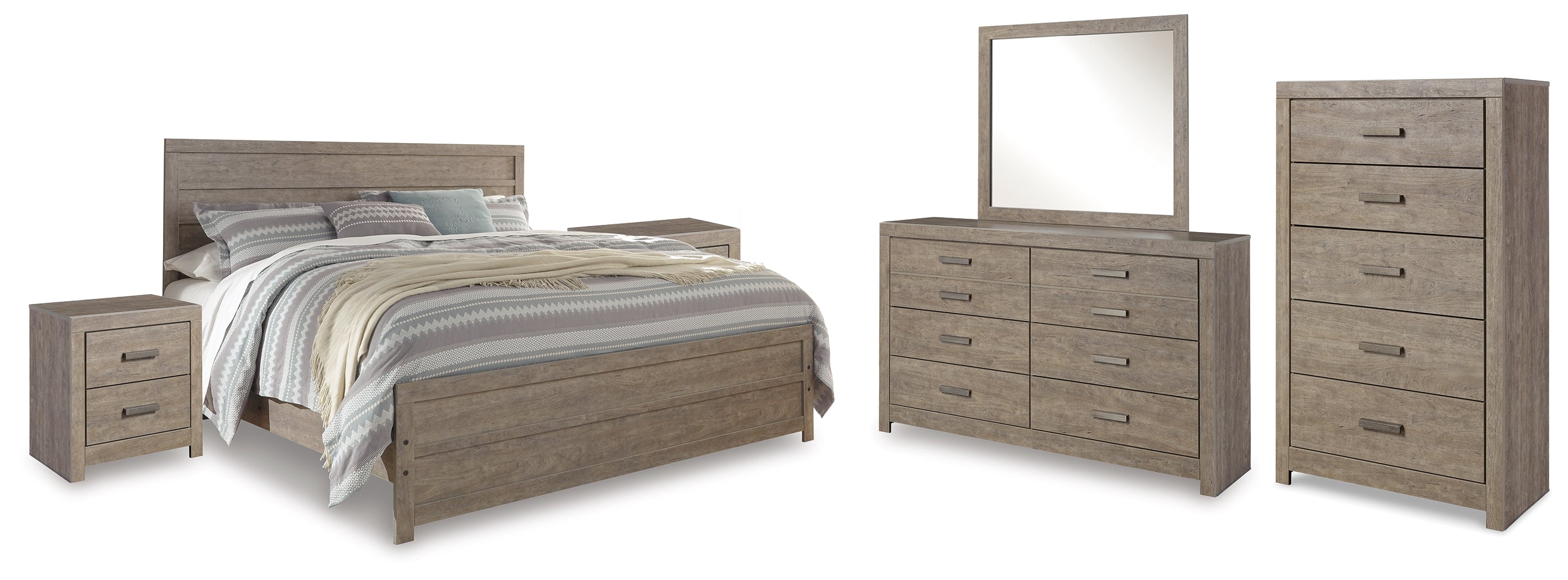 Culverbach King Panel Bed with Mirrored Dresser, Chest and 2 Nightstands in Gray