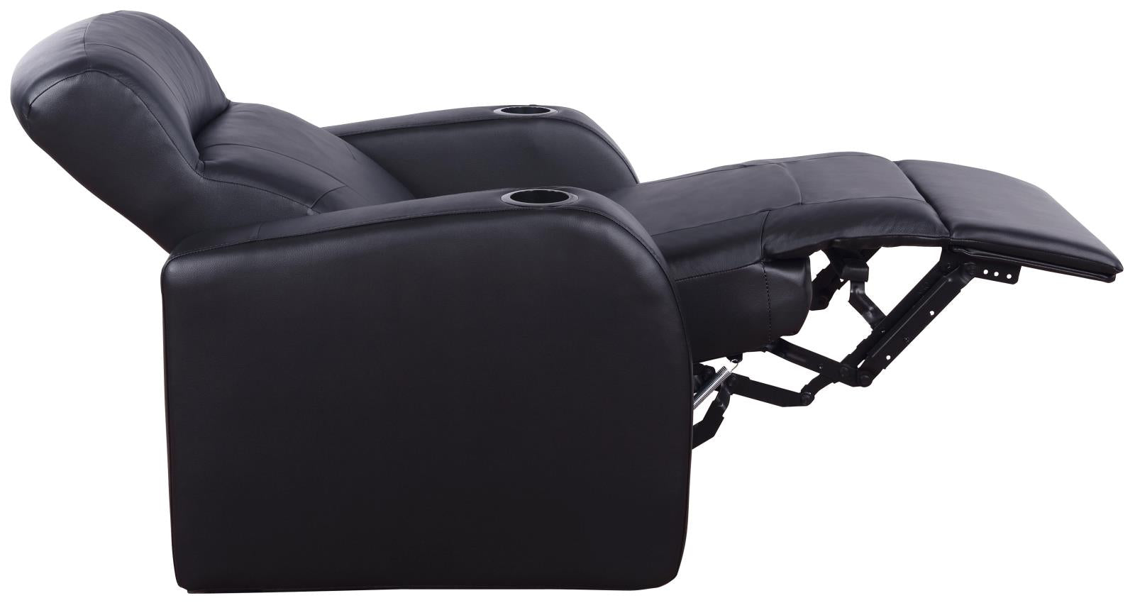Get the movie theater experience at home with this set of recliners. Customize your home theater with your choice of seating configuration, available in numerous options. Optional center consoles offer unique storage for remotes and small items. Each top grain leather recliner is designed with its own cup holder for your favorite beverage. These black recliners are bound to improve your home theater experience and comfort levels.