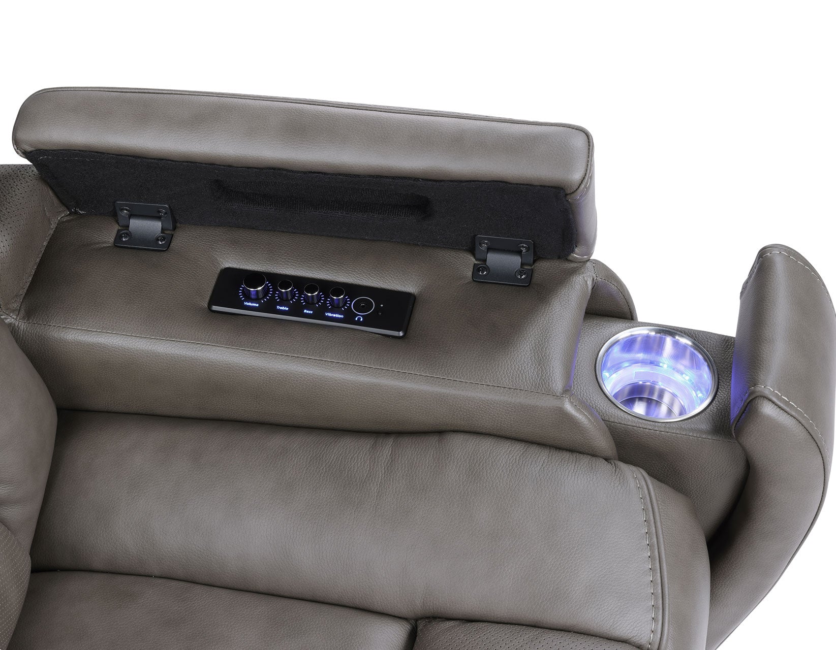 Experience the theater from the comfort of home with the Daniel Triple-Power Leather Immersive Entertainment Recliner with Built-in Speakers. Wrapped in plush, mossy-gray leather, this recliner is designed for immersive entertainment. Built-in speakers, a subwoofer, and vibration transponders surround you with lifelike sound, while air massage and soothing heat settings add next-level relaxation. Popup arms offer convenient bass, treble and vibration control, while the outer console has USB-A &C charging, integrated lighting and programmable memory settings. Enjoy the ultimate blend of luxury, comfort, and high-tech entertainment with the Daniel Triple-Power Leather Immersive Entertainment Recliner with Built-In Speakers.