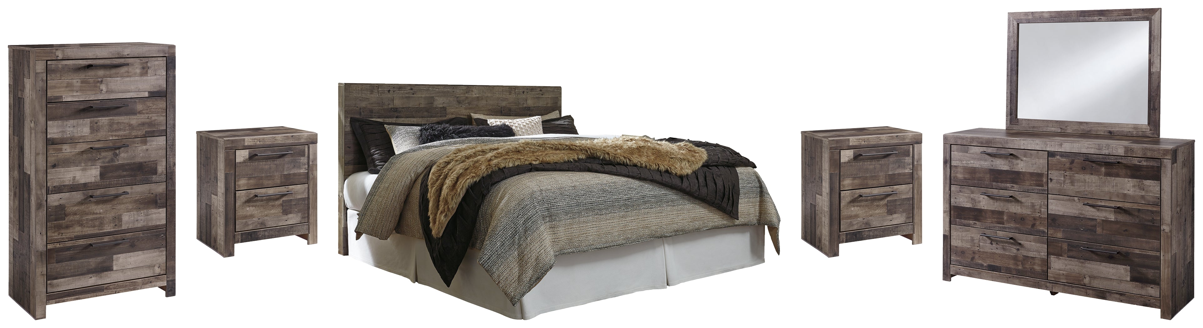Derekson King Panel Headboard Bed with Mirrored Dresser, Chest and 2 Nightstands in Multi Gray
