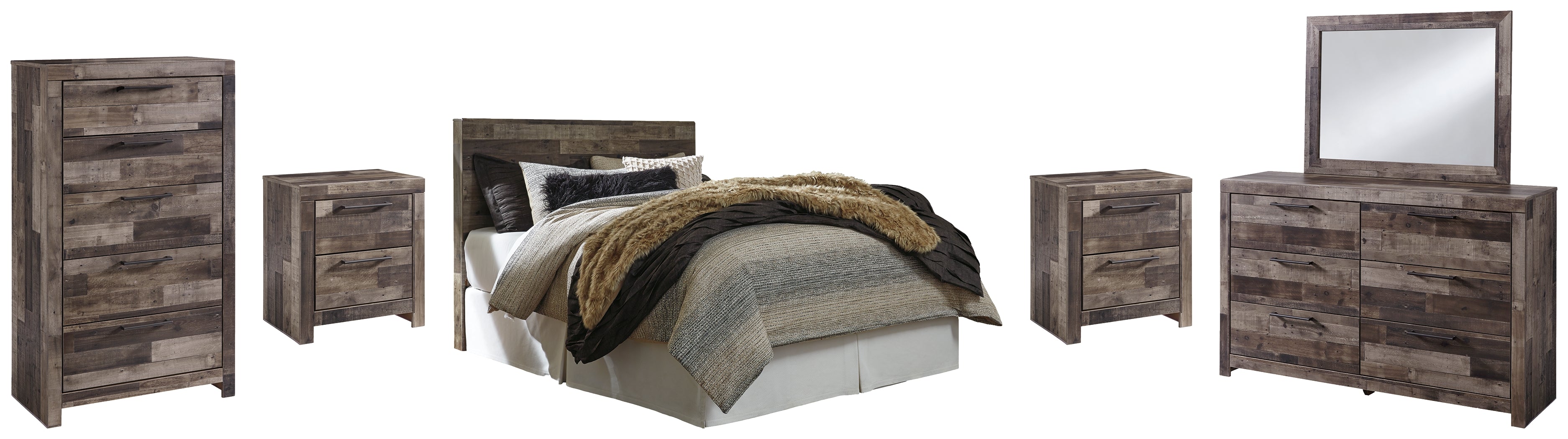 Derekson Queen/Full Panel Headboard Bed with Mirrored Dresser, Chest and 2 Nightstands in Multi Gray
