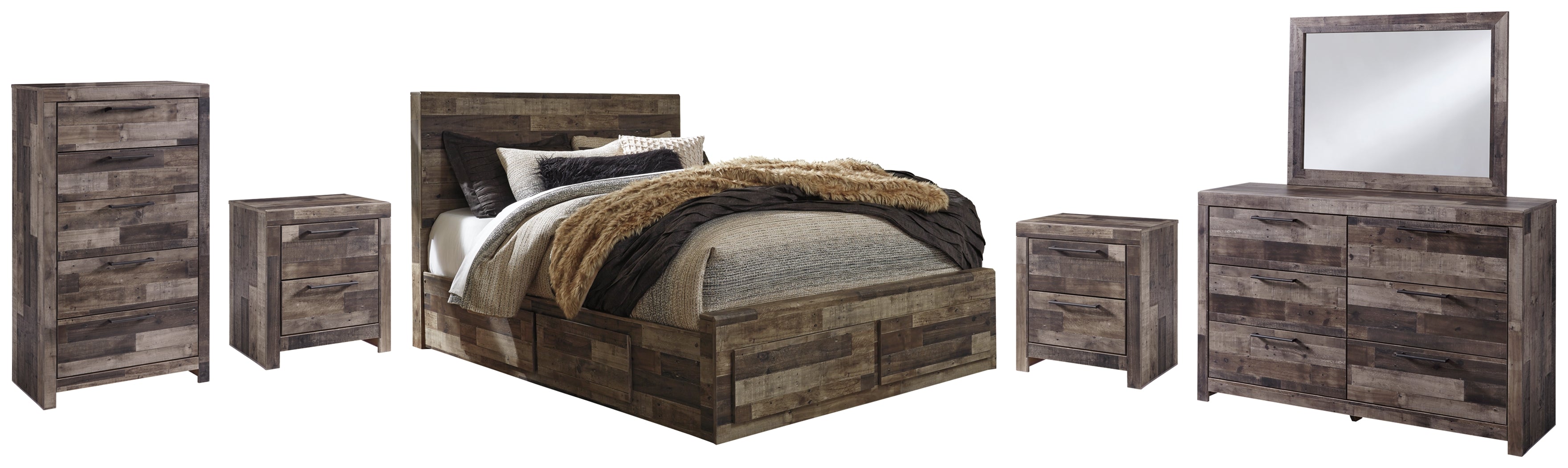 Derekson Queen Panel Bed with 6 Storage Drawers with Mirrored Dresser, Chest and 2 Nightstands in Multi Gray