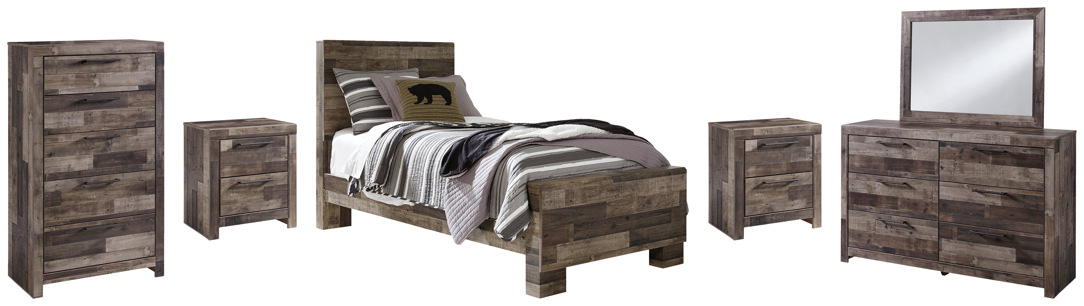 Derekson Twin Panel Bed with Mirrored Dresser, Chest and 2 Nightstands in Multi Gray