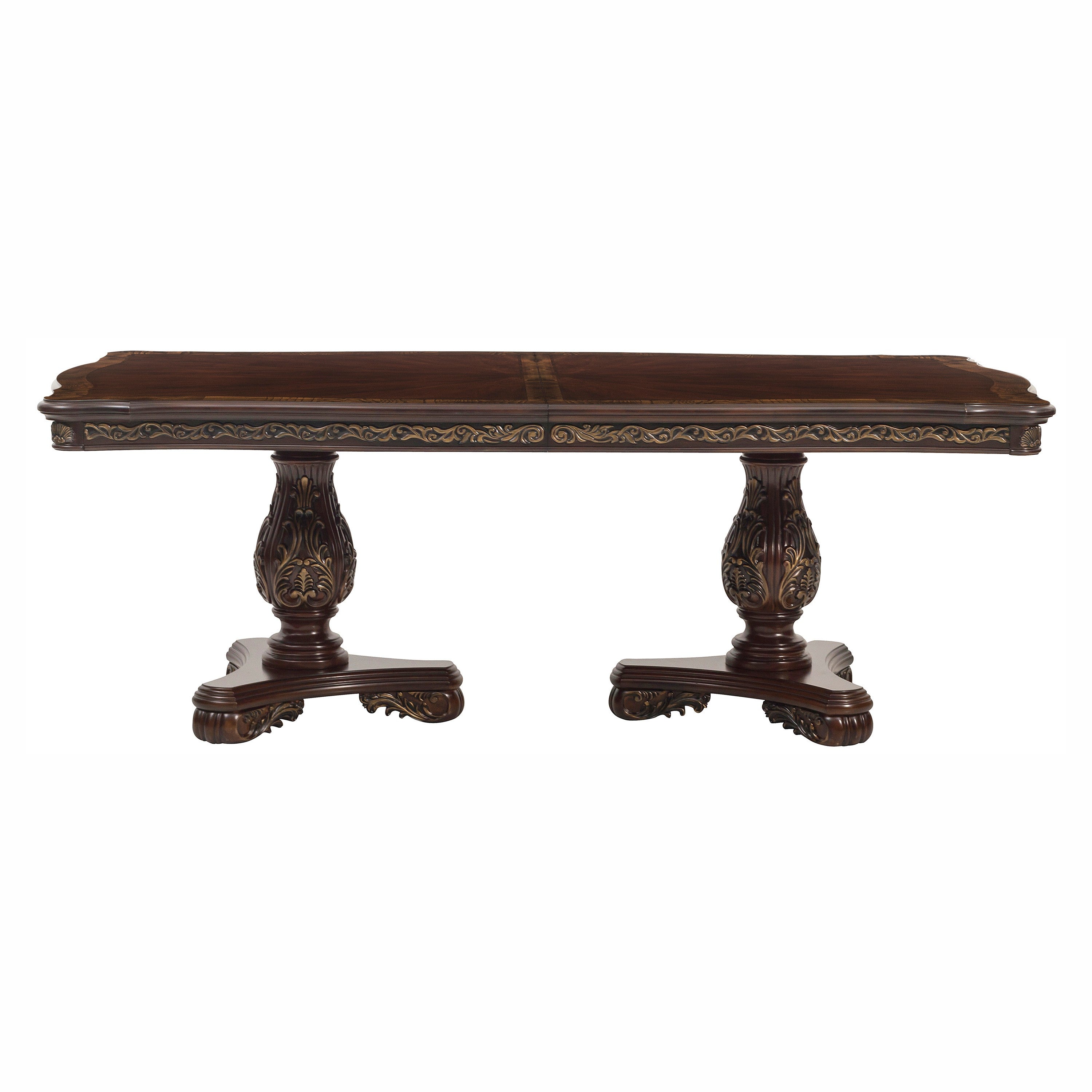 Walking into the dining room that is occupied by the Deryn Park Collection will immediately invoke your love of the traditional aesthetic. Stately from every angle, sophisticated design elements blend to create this beautiful dining table. The cherry finish is highlighted by gold tipping that accentuates the traditional dining table.