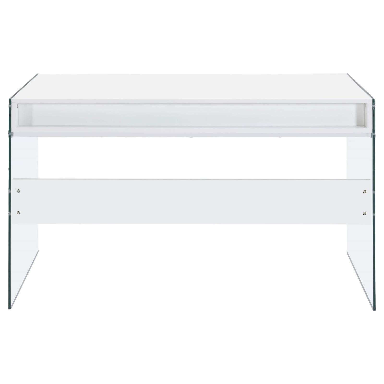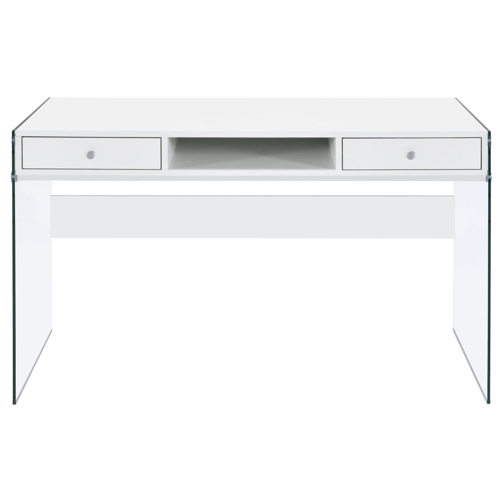 With its cool, contemporary appeal, this versatile writing desk works well in a bedroom or living room. It creates a functional space to work and study without sacrificing style. Bold, thick, tempered glass panels form its base supports, giving it an inspired touch of glamour. Its striking aesthetic is brought to life with a finish of glossy white. This desk is complete with an open center compartment and two drawers, adding extra convenience while maintaining its sleek look.