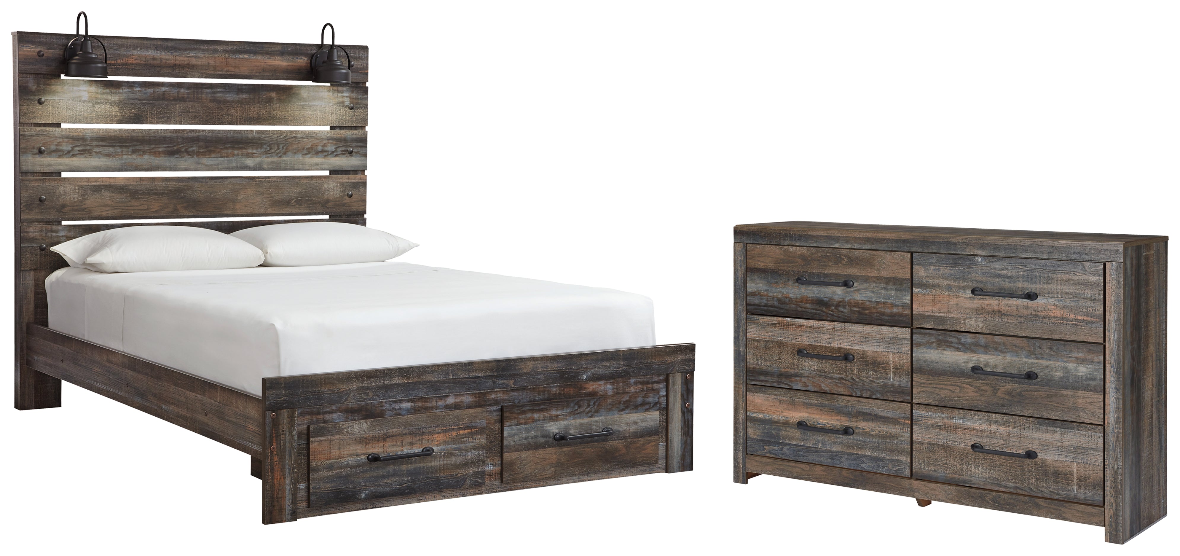 Drystan Queen Panel Bed with 2 Storage Drawers with Dresser in Multi