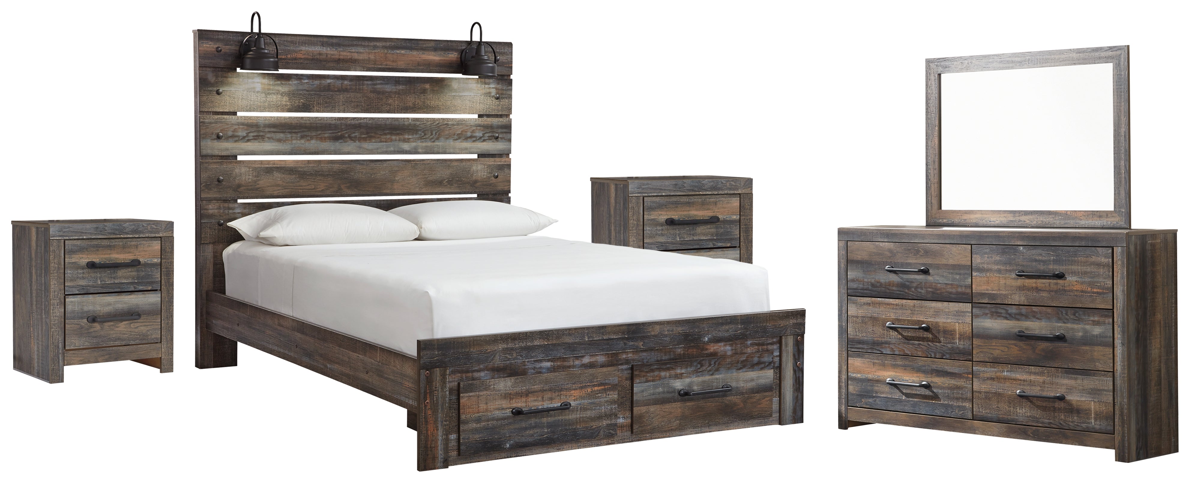 Drystan Queen Panel Bed with 2 Storage Drawers with Mirrored Dresser and 2 Nightstands in Multi
