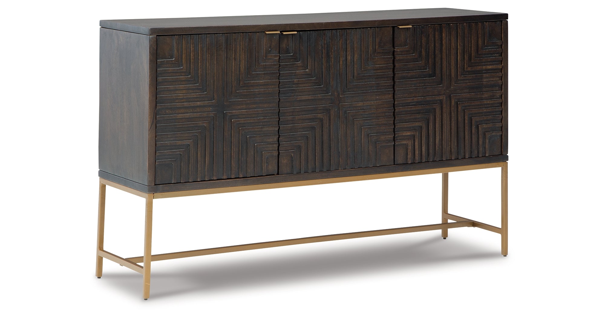 This accent cabinet is a versatile stunner with 3 geometric patterned door fronts in warm dark brown accented with goldtone finish metal hardware. Standing on a goldtone metal open frame base, the three-door console is aesthetically contemporary and sophisticated, ready to serve as buffet, console or media cabinet. — Luna Furniture introduces Elinmore Accent Cabinet to enhance the beauty of your living spaces.