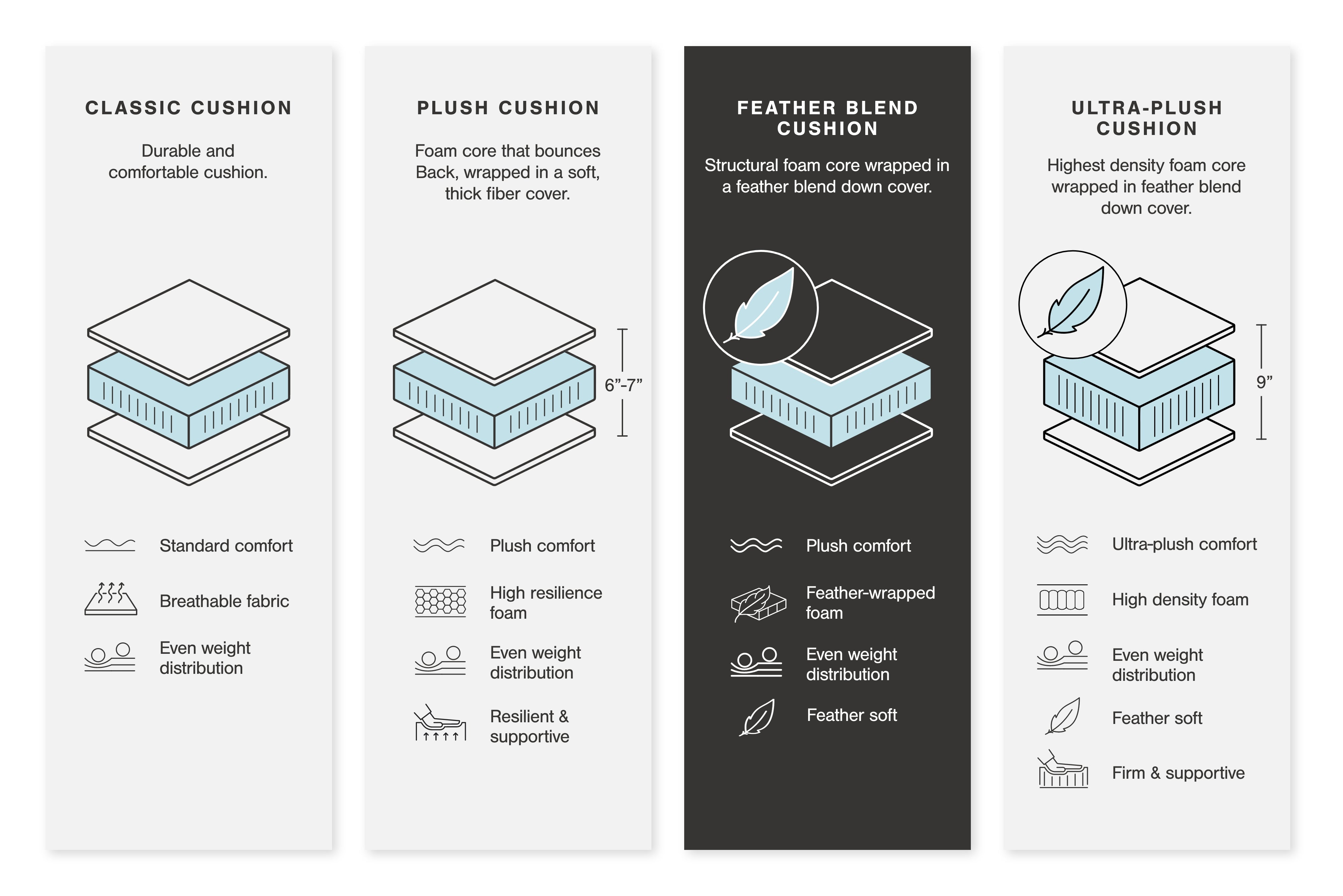 • Seat cushions with feather-fiber blend encasing a foam core