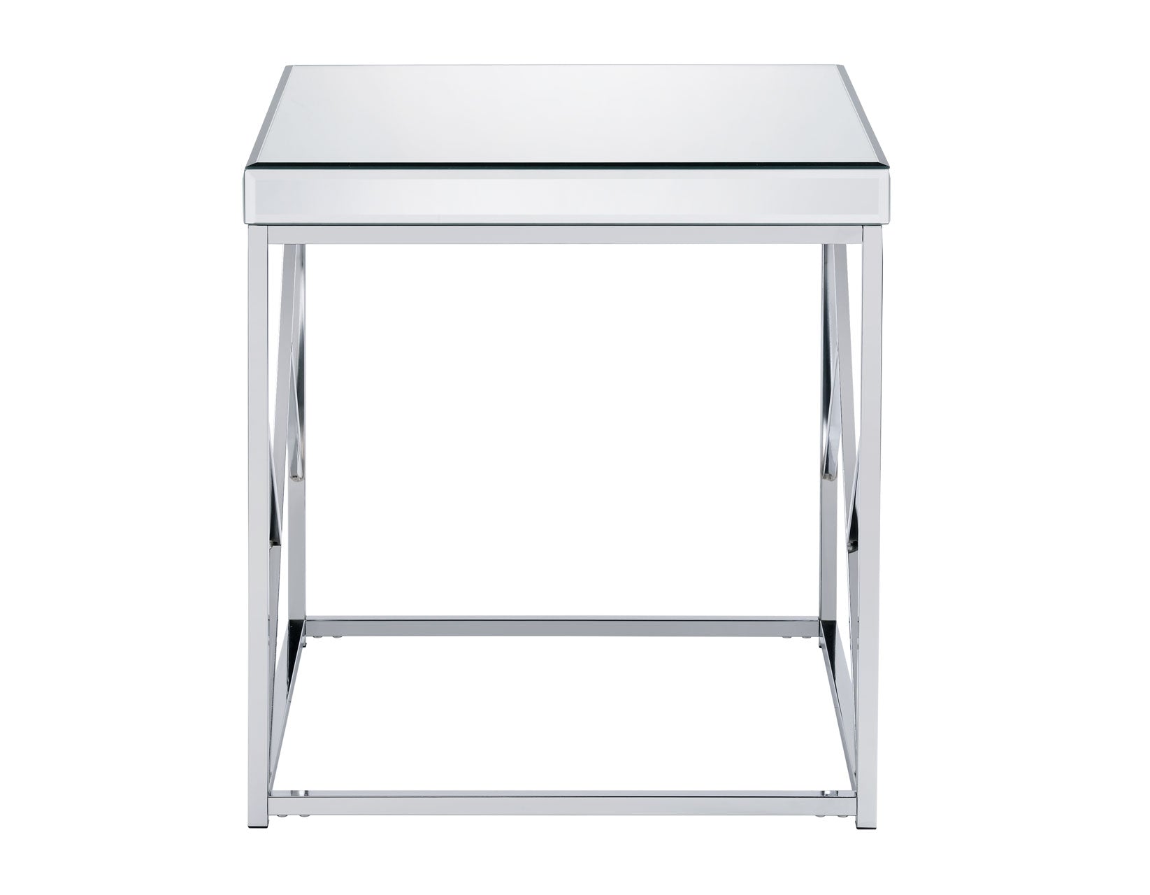 The Evelyn set offers modern elegance with its geometric base design and boxed mirrored top. You will enjoy how the light bounces off the table top and apron Rail to create a larger more vibrant space. The mirrored table also features a sturdy iron base that is finished with a sparkling chrome.