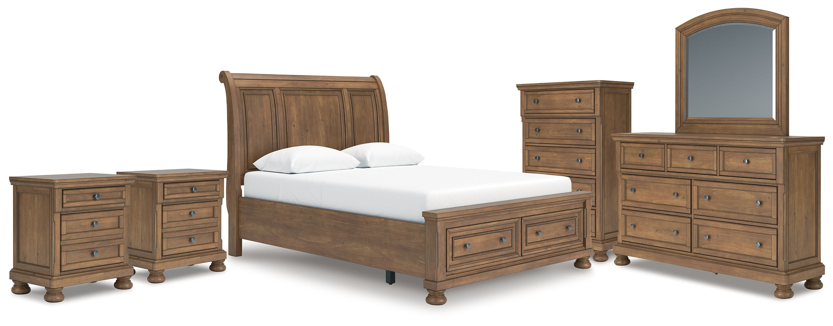 Feddinger Queen Storage Sleigh Bed with Mirrored Dresser, Chest and 2 Nightstands in Medium Brown