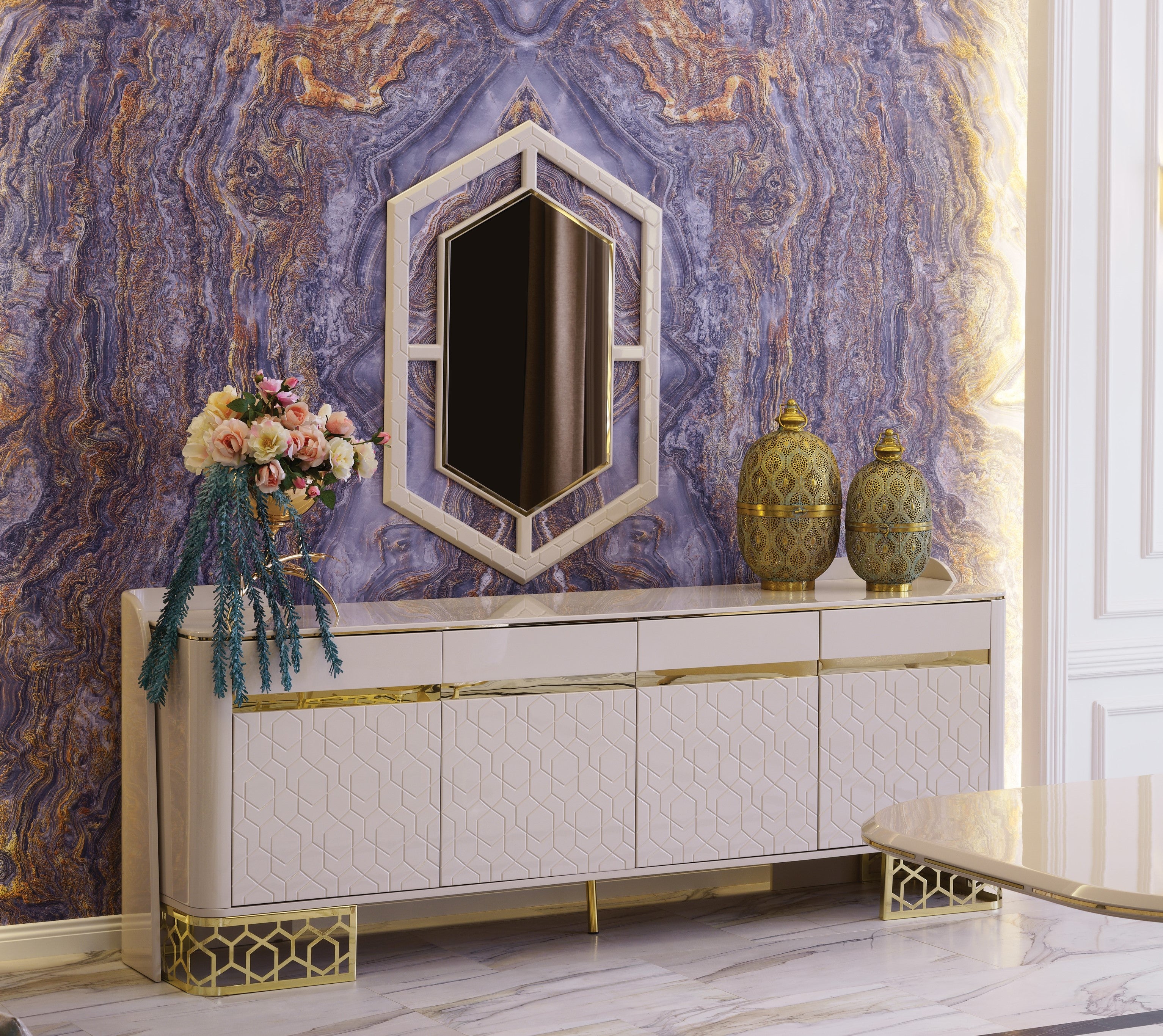 • Sideboard Material: MDF with high-gloss lacquer and gold-accented geometric detailing