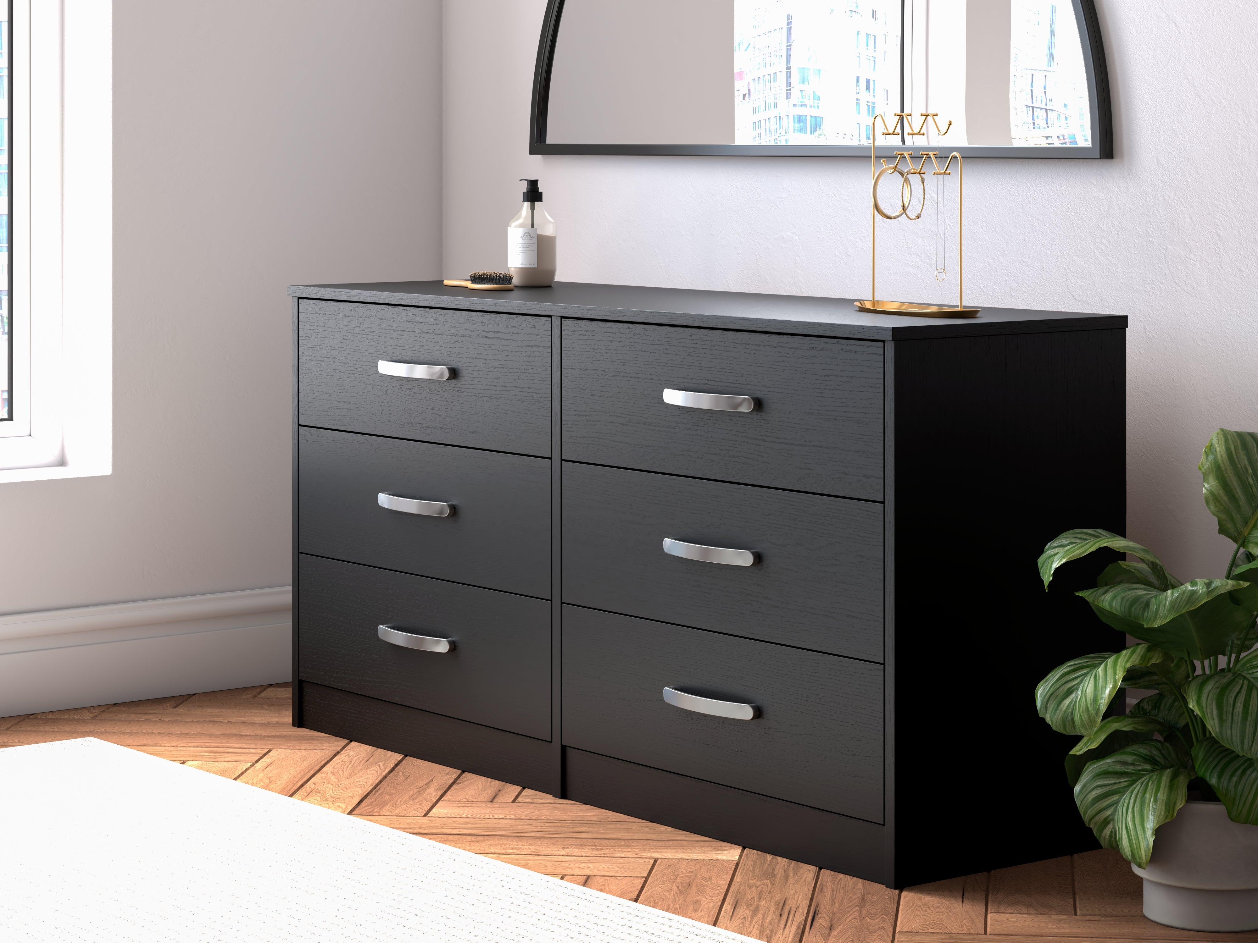 If you’re a fan of clean, crisp and contemporary interiors, rest assured this bedroom package suits you. Its linear profile is enhanced with a matte black finish with subtle replicated wood grain. Spacious drawers with sleek metal pulls add to this set's streamlined aesthetic.