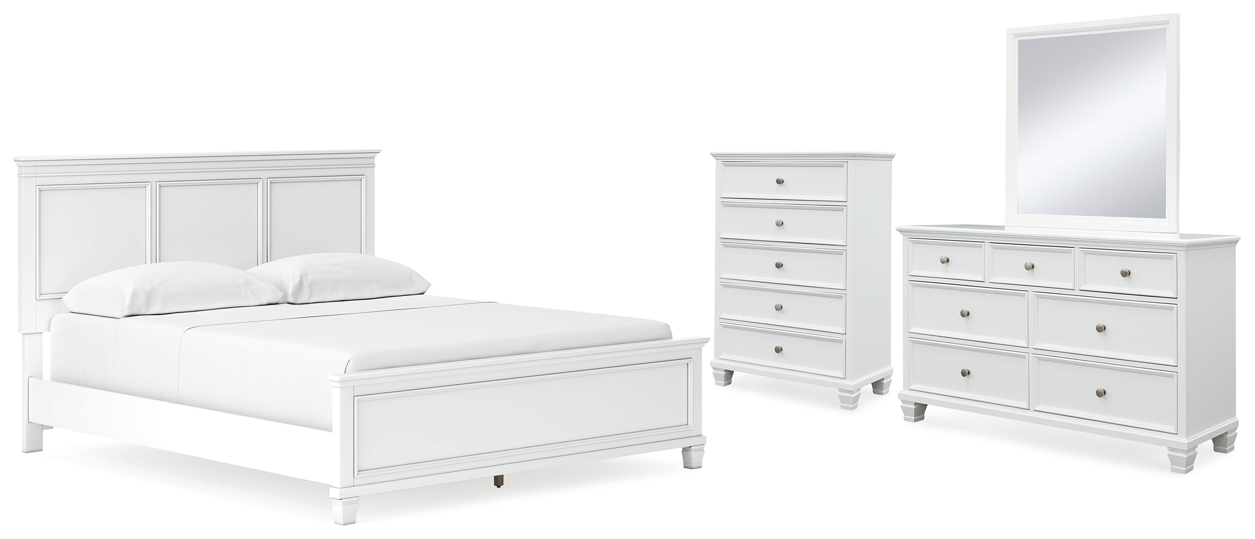 Fortman California King Panel Bed with Mirrored Dresser and Chest in White