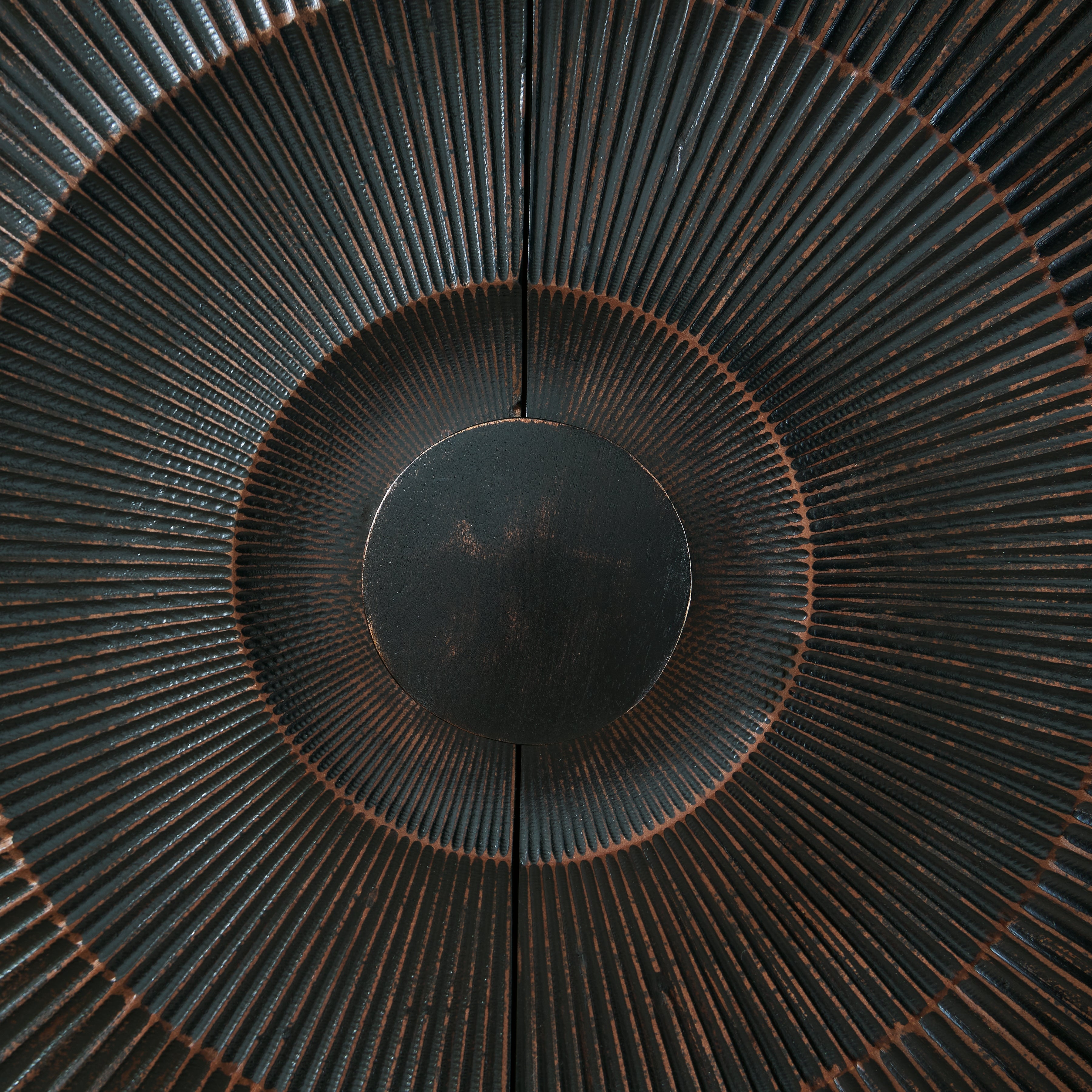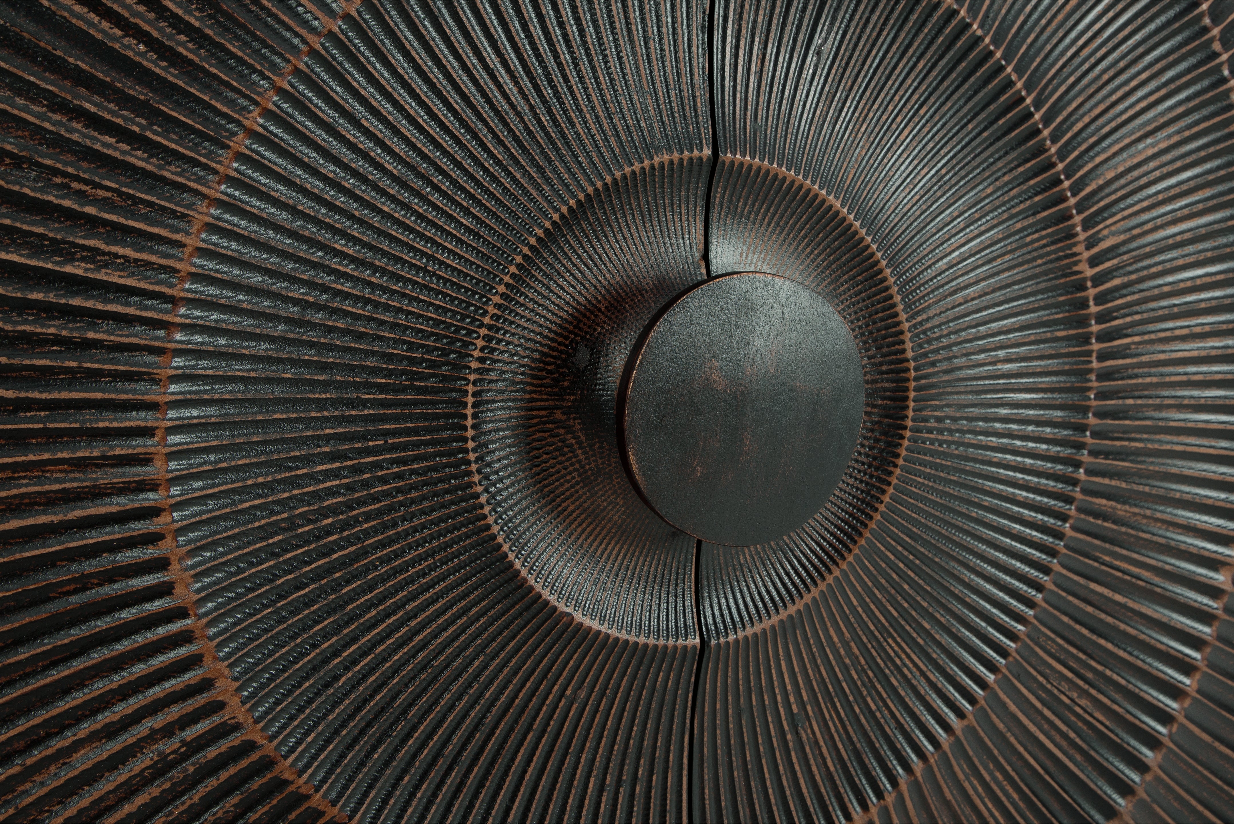 High style is on the rise with this wood accent cabinet. Its stunning doors, graced with a carved sunburst pattern and oversized wood pull, open to reveal two shelves. A distressed black finish adds contemporary flair. Whether this cabinet is accommodating storage needs or hiding clutter, it's truly a showpiece. — Luna Furniture introduces Fosterman Accent Cabinet to enhance the beauty of your living spaces.