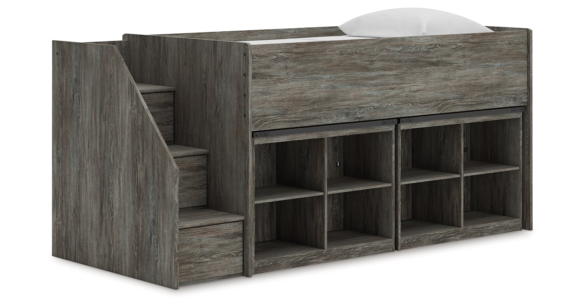 Includes loft bed, left storage steps with loft ends, roll slats and 2 loft bookcases