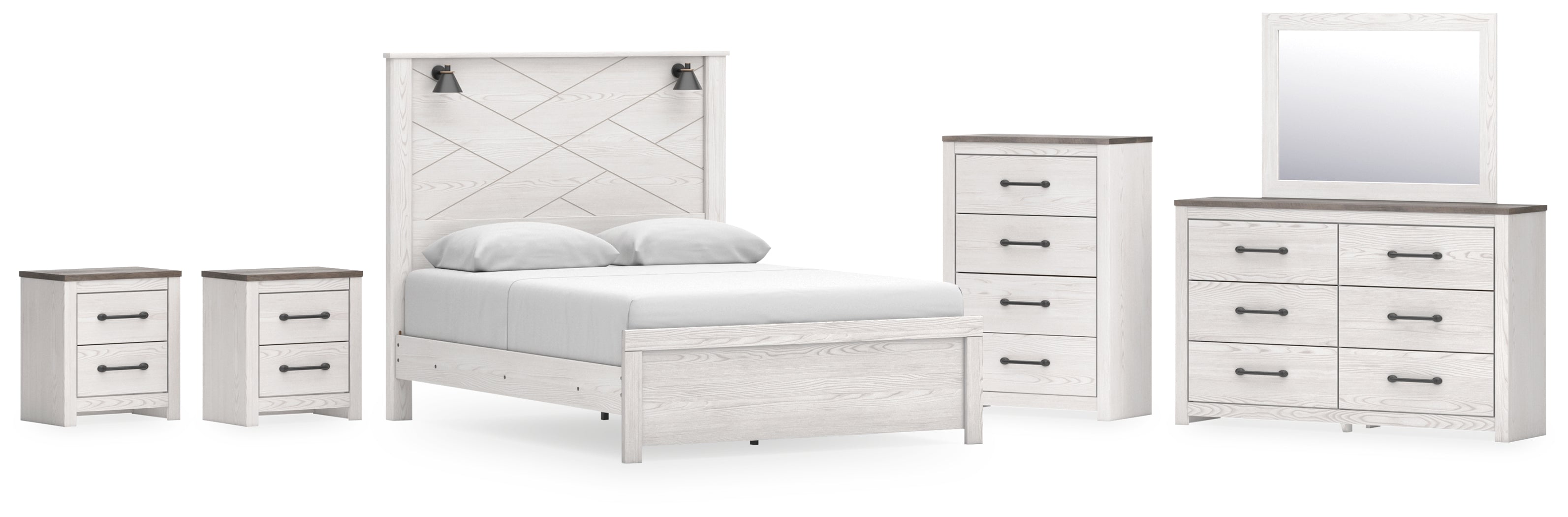 Gerridan Queen Panel Bed with Mirrored Dresser, Chest and 2 Nightstands in White/Gray