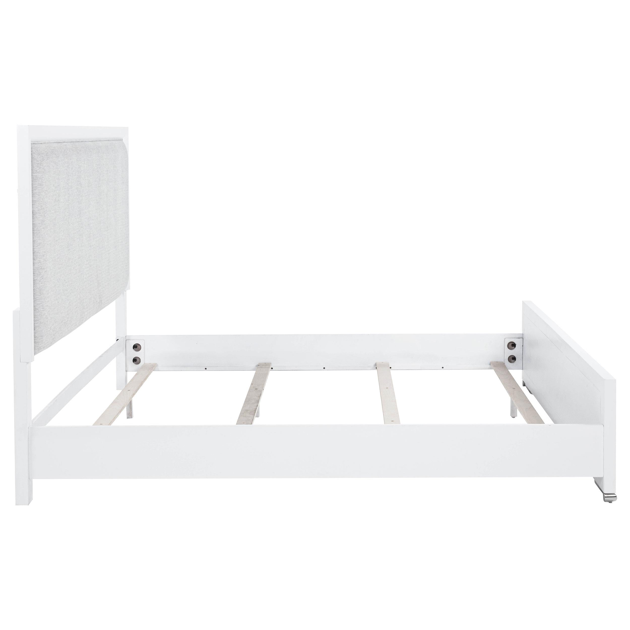 This panel bed pairs crisp framing with soft textures for a look that feels both refined and restful. The panel-style headboard and footboard are upholstered in light grey fabric with subtle herringbone texture, bordered by a clean white frame and finished with brushed nickel feet. Crafted from solid rubberwood, engineered wood, and foam padding, it offers visual contrast and supportive comfort. Foundation required.
