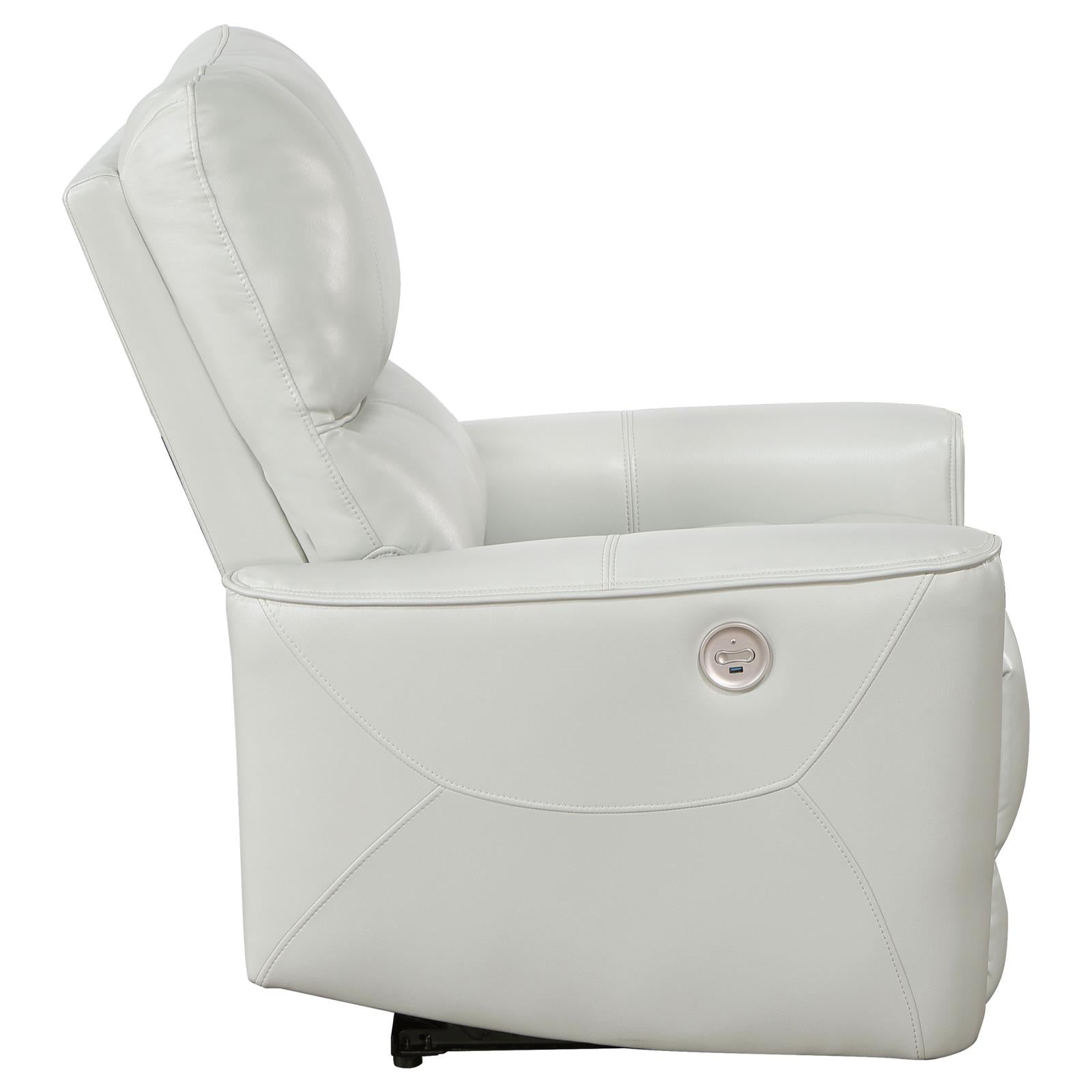 Contemporary elegance plays out in a clean, modern design as the power recliner delivers beauty and comfort to a space reserved for easy entertaining and relaxing. Ivory leatherette upholstery covers wood framing to provide a sturdy build, embellished with plump foam fill in a tall, attached back cushion and supportive seat cushion. Subtle tufting cradles body positioning, aided in luxurious comfort by power reclining at the touch of a button on a switch panel with a handy USB port. The versatility of a clean ivory finish joins a delightfully simple yet elegant style motif to make this power recliner a hit in any modern space. This power recliner is all that's needed for a relaxing day or evening.