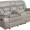 Every entertainment area deserves this glider loveseat with console. The neutral color palette makes it easy to blend with your decor. Its performance-grade upholstery ensures a comfortable seating experience. A center console offers a small storage area for removes with a lift-top container within. Find an easy place to store drinks with the built-in stainless steel cupholders.