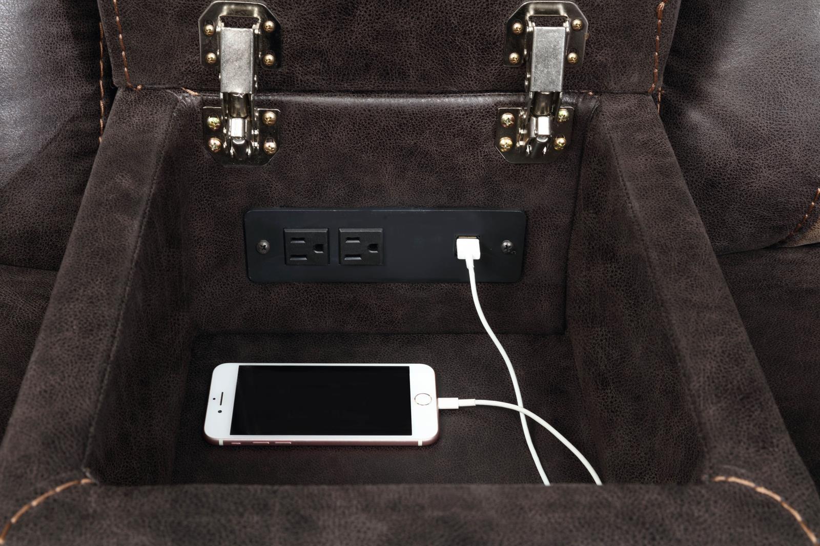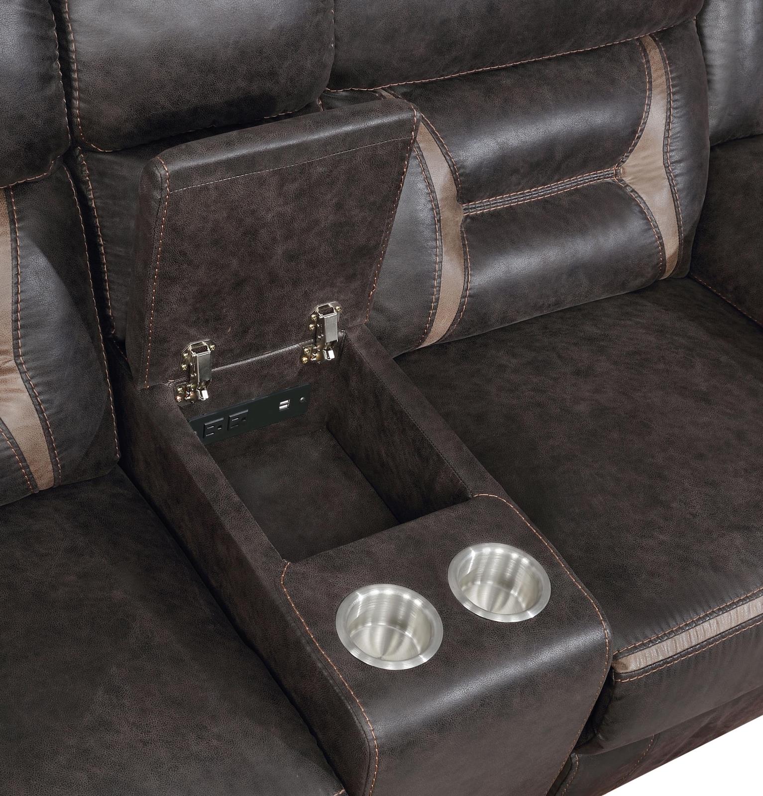Every entertainment area deserves this glider loveseat with console. The neutral color palette makes it easy to blend with your decor. Its performance-grade upholstery ensures a comfortable seating experience. A center console offers a small storage area for removes with a lift-top container within. Find an easy place to store drinks with the built-in stainless steel cupholders.