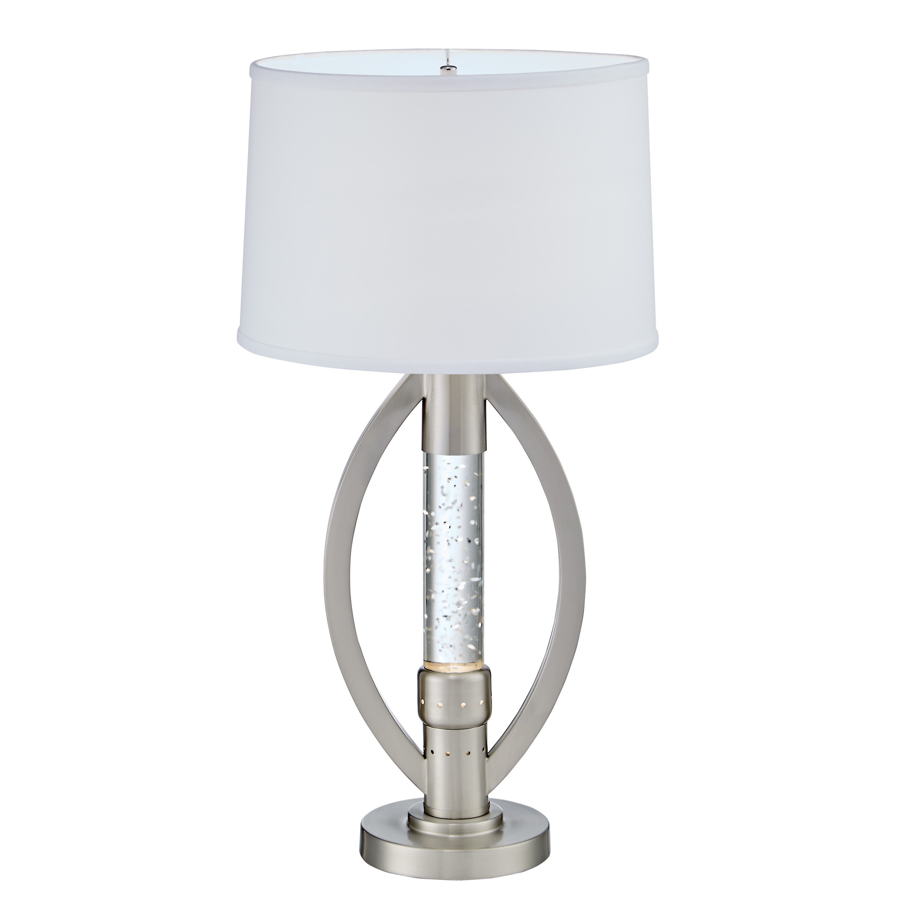 This accent lighting can change the ambiance of any room. Its ultra modern design showcases sparkling decorative mood light, with tiny rippling water-droplets to simulate the soothing dancing water motion. Beautifully crafted stand features high quality satin nickel finish metal and glass, and an elegant circular lamp shade. Great addition piece on your night stand, end table, or sofa table. It offers flexible lighting solution: a table lamp with a main light that is suitable for reading, perfect for a night light, and to create the mood in any room.