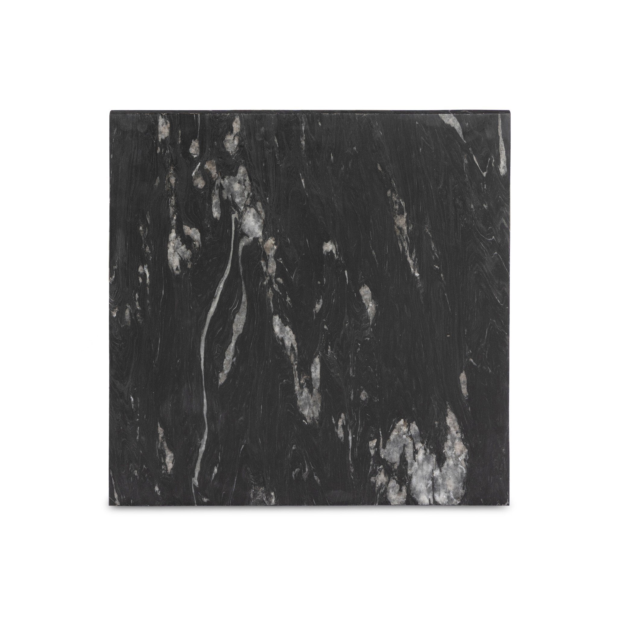 - An open, hand-hammered base of black iron supports a squared top of charcoal marble, for a beautifully streamlined look with rustic vibes.