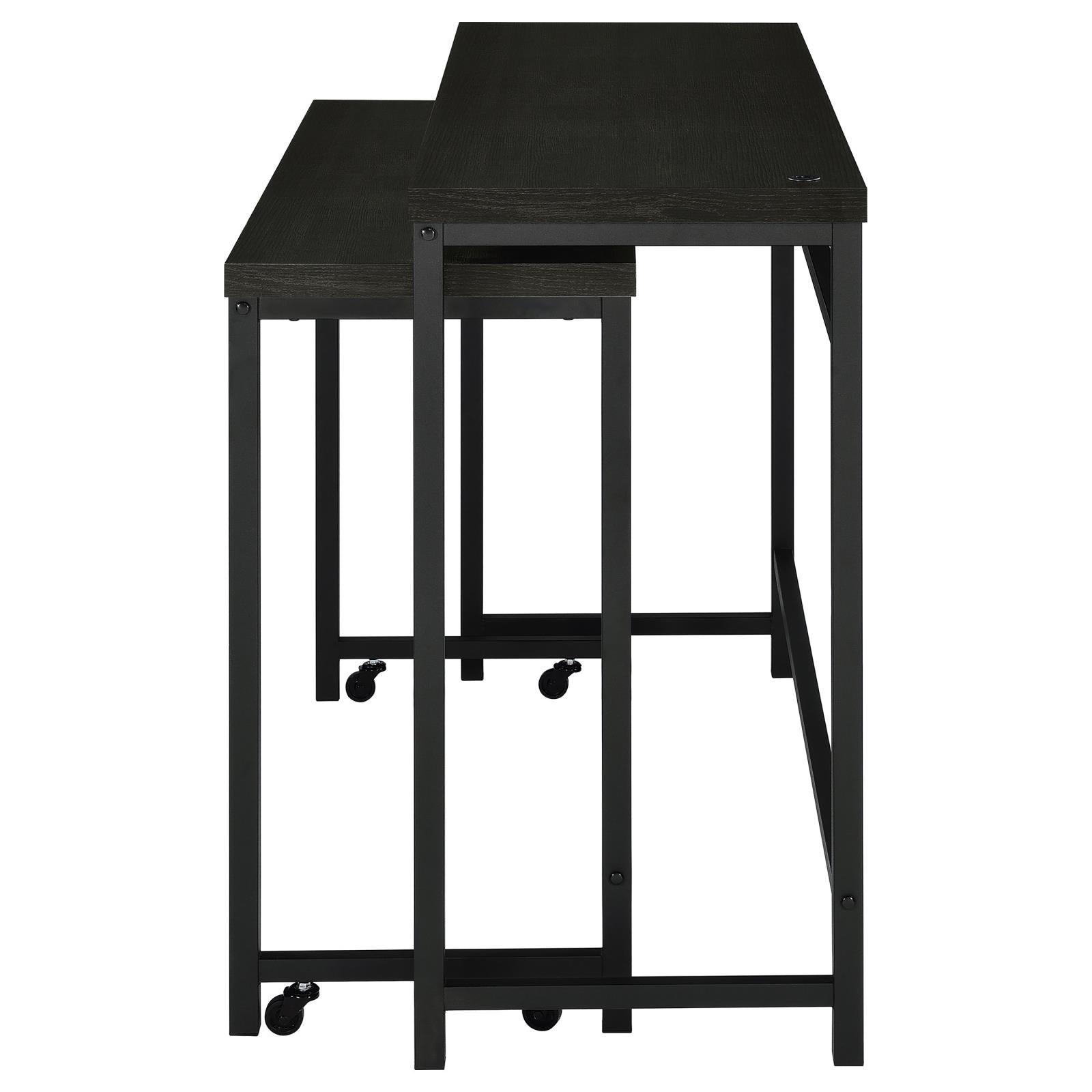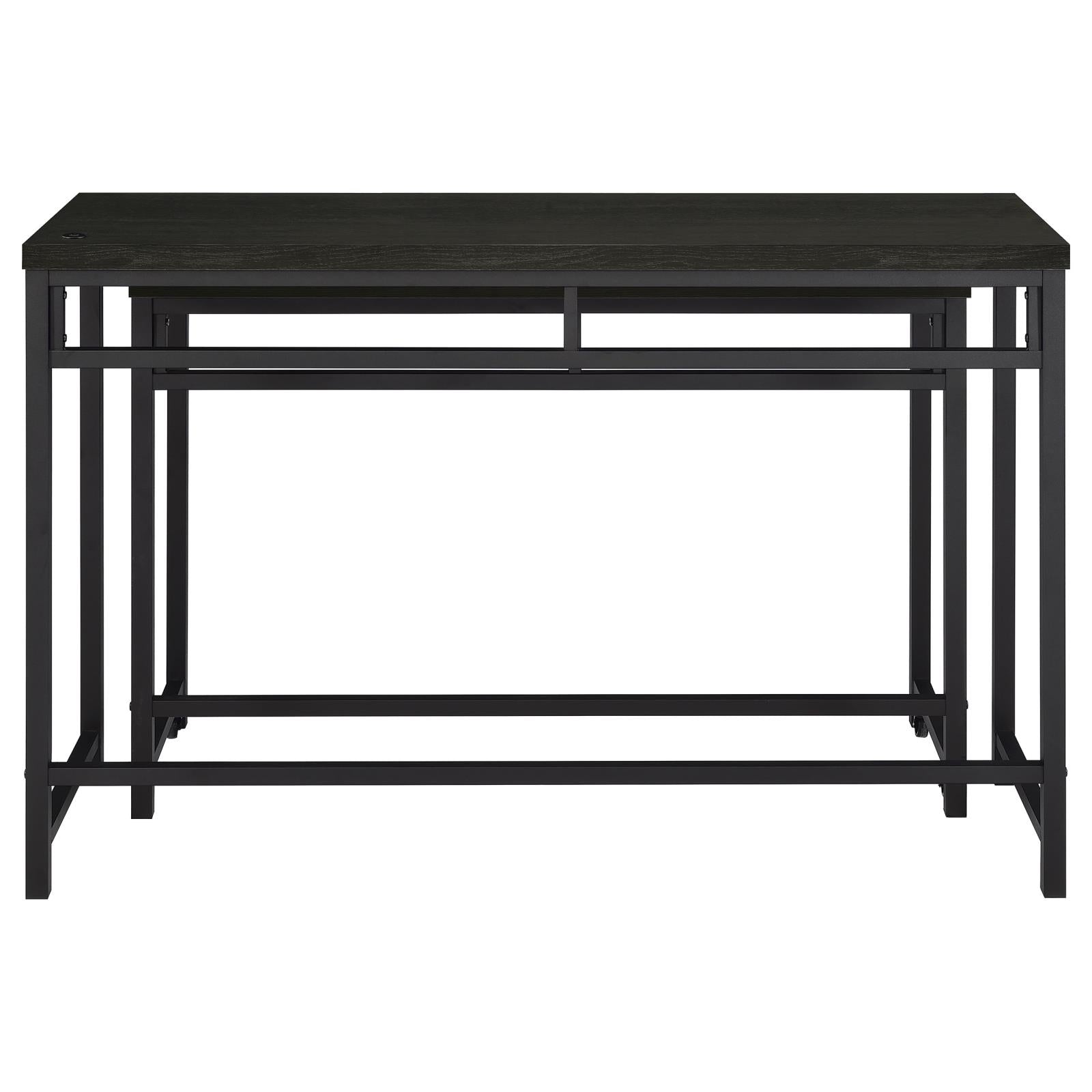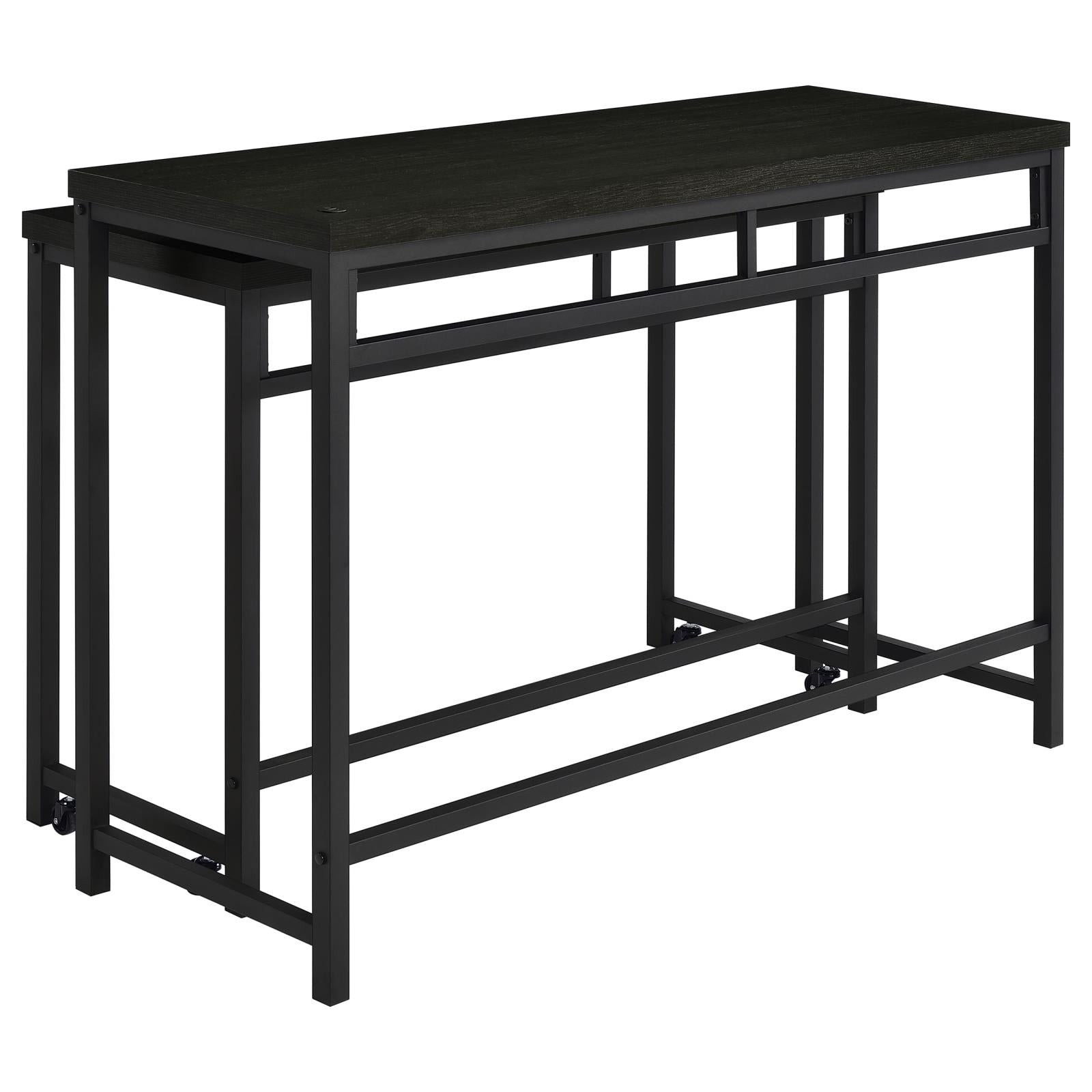 When space is at a premium, this modern four-piece counter height dining set does everything you need and more, easily serving as dining table, workspace, or homework spot. It features clean, crisp design with straight lights and square corners, all in a black finish that blends into surrounding decor in virtually any setting. The larger table includes a USB port in its top, while the smaller nesting table is on wheels that allow for easy movement to the perfect position for every occasion. Two stools are backless, with plush foam cushions and faux leather upholstery. Built in footrests offer added comfort and support for all to enjoy.