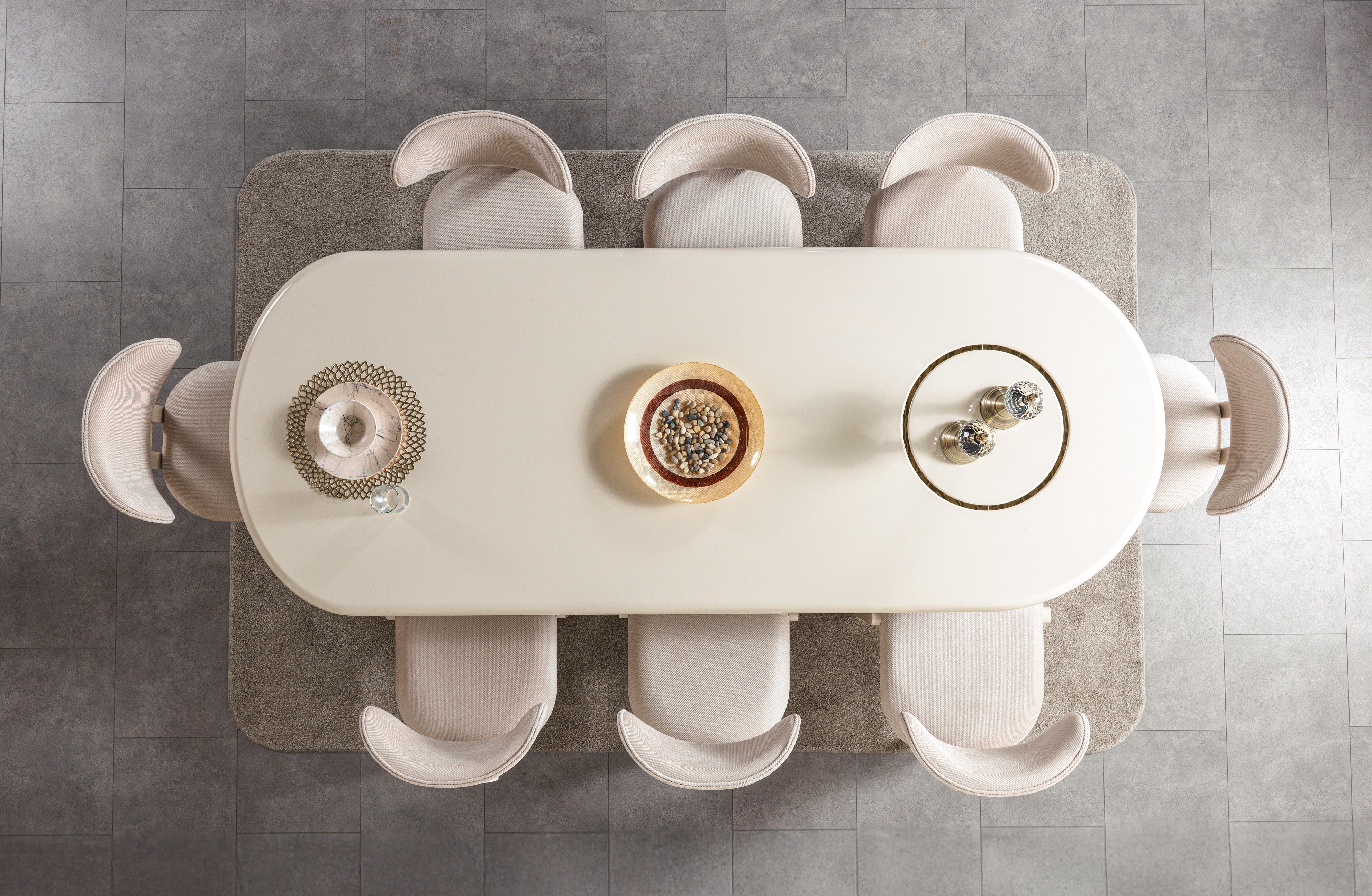 Elevate your dining experience with the Helena Ivory 9-Piece Dining Set by Nova Furniture—a masterpiece of contemporary design that brings luminous elegance and architectural flair to the heart of your home. This expansive set features a stunning oval dining table paired with eight meticulously crafted chairs, creating a cohesive look that is both inviting and impressively sophisticated. The high-gloss ivory finish reflects ambient light, making your dining area feel brighter and more spacious, while the unique U-shaped pedestal base with metallic gold accents provides a striking focal point. Whether you are hosting a formal holiday dinner or enjoying a casual brunch with family, the Helena set offers the perfect balance of modern luxury and everyday functionality. The ergonomic chairs, upholstered in a premium textured fabric, ensure your guests remain comfortable long after the meal has ended. Luna Furniture introduces the Helena Ivory Dining Set to transform your dining room into a sanctuary of style and grace.