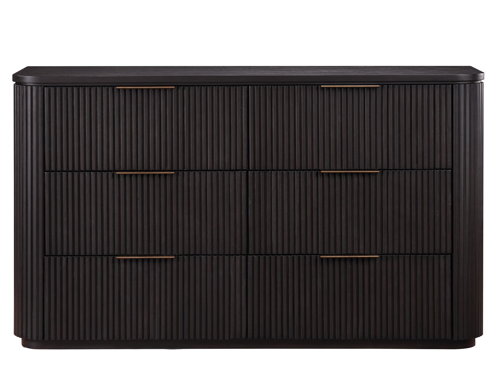 The Henry 65″ 6-Drawer Reeded Dresser offers modern elegance and ample storage. Crafted from oak veneers, Asian hardwoods, and engineered woods, it features reeded surfaces, rounded corners, and a sturdy plinth base. The six drawers, including a felt-lined top drawer, provide organized storage for essentials. Side metal drawer glides ensure smooth operation, while safety stops prevent accidental drawer removal. Constructed with kiln-dried wood and mortise-and-tenon joinery for stability, the hand-stained espresso finish highlights the wood’s natural grain. Demure oil-rubbed brass pulls enhance its elegance. Anti-tip restraint kit included for safety.