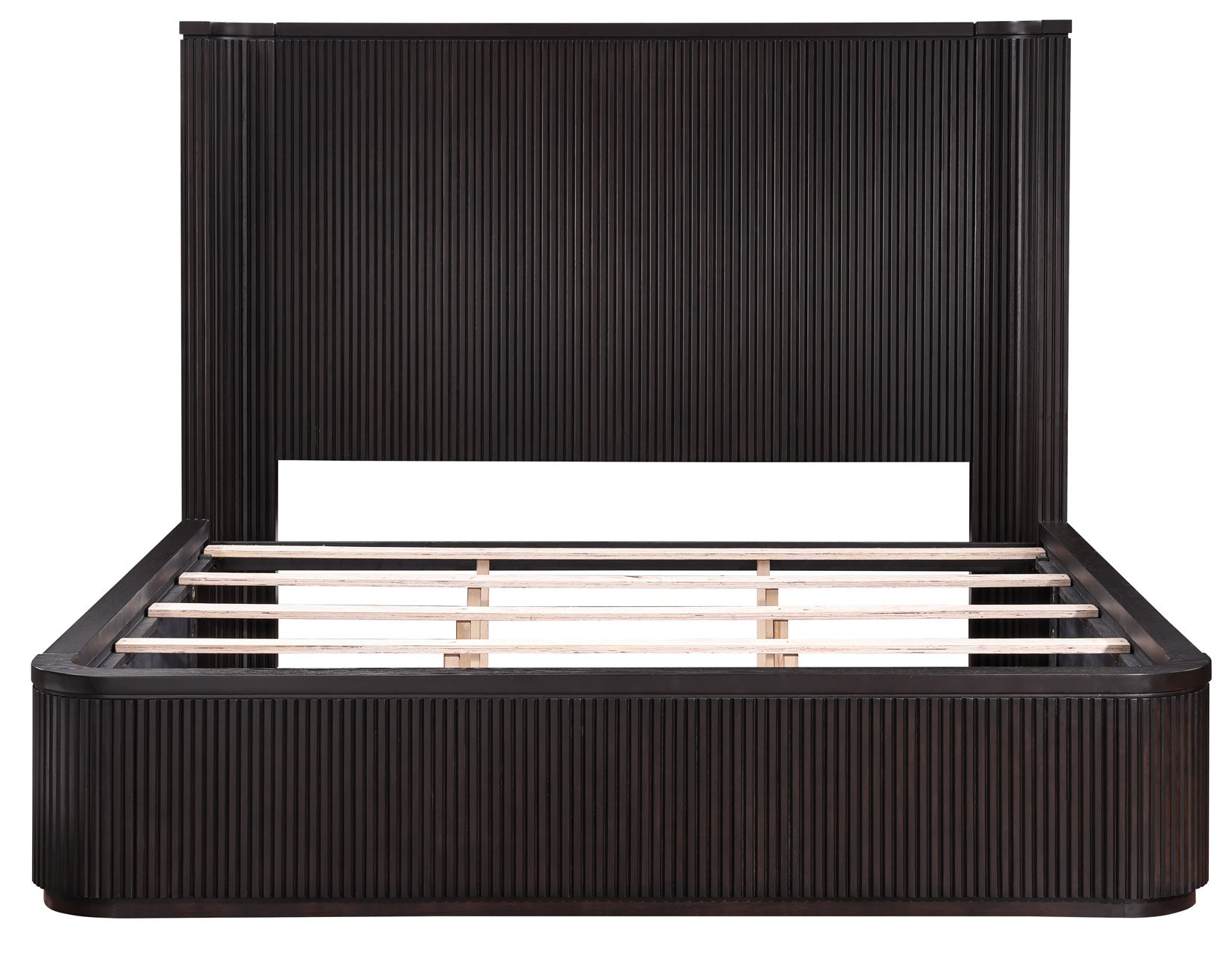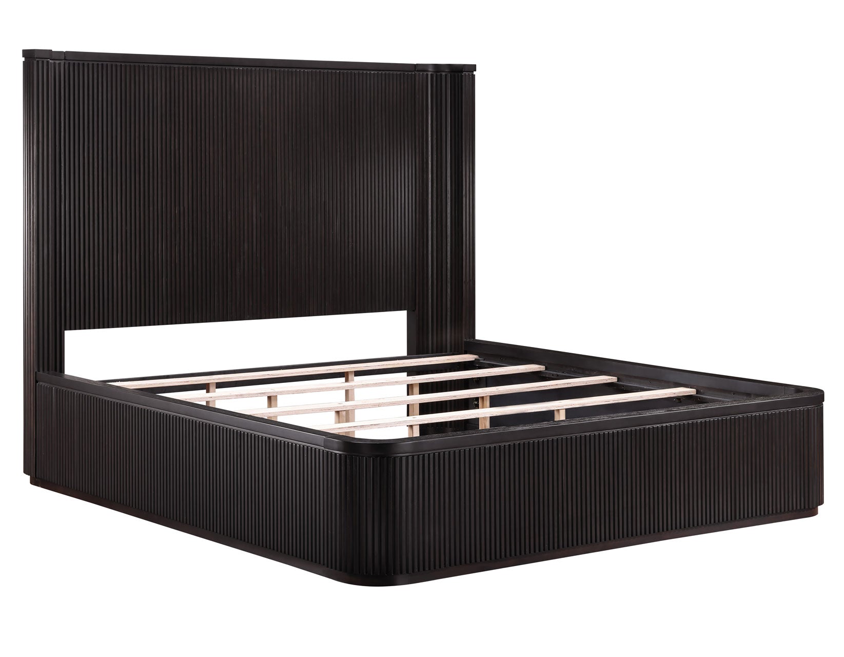 The Henry King Bed combines sleek modern design with softened edges, rounded corners, and elegant reeded detailing. Crafted from sturdy oak veneers in a lustrous espresso finish, it brightens the space and serves as a stylish yet understated anchor for your room. The headboard’s inverted corners provide a cozy nook, ideal for reading, watching TV, or relaxing in comfort.