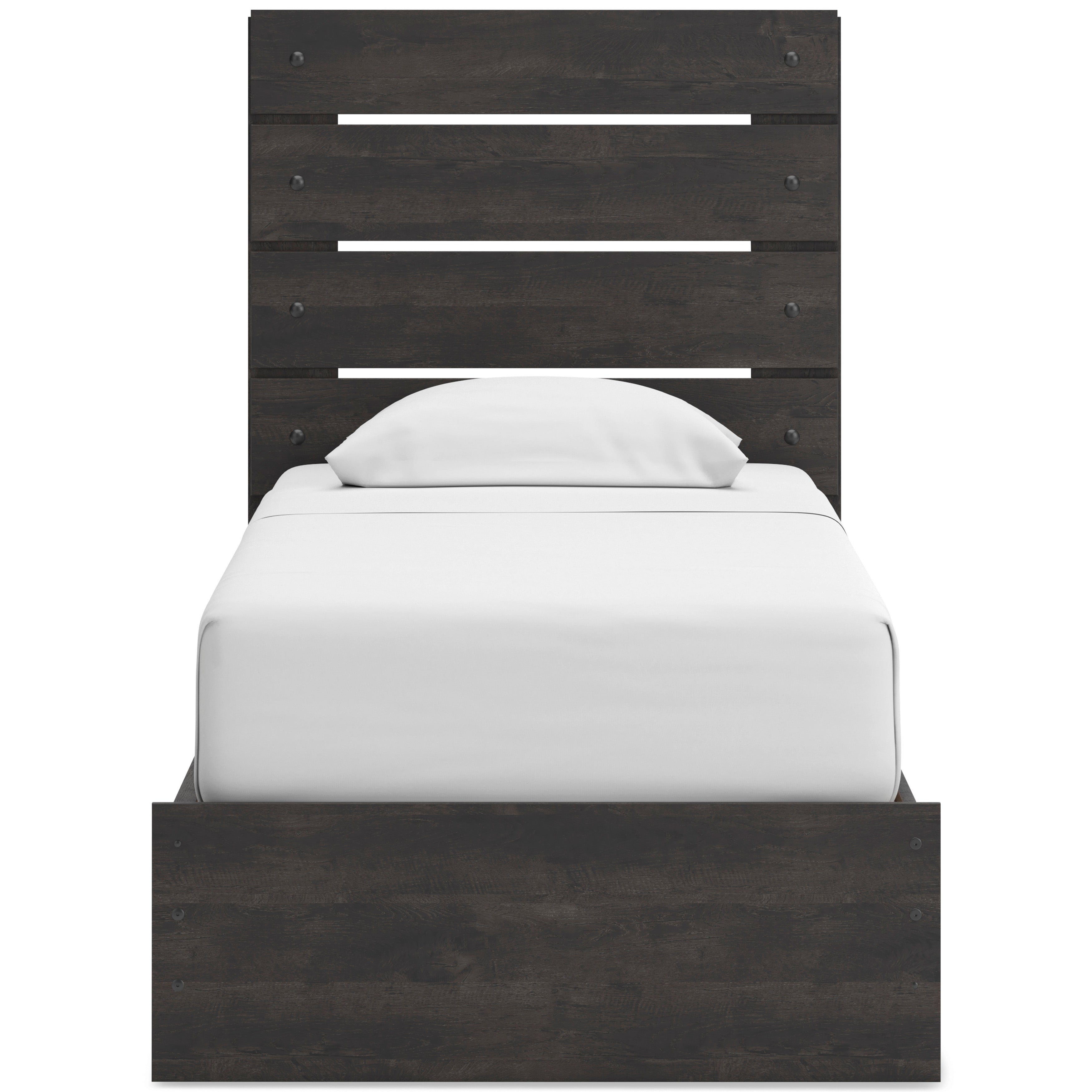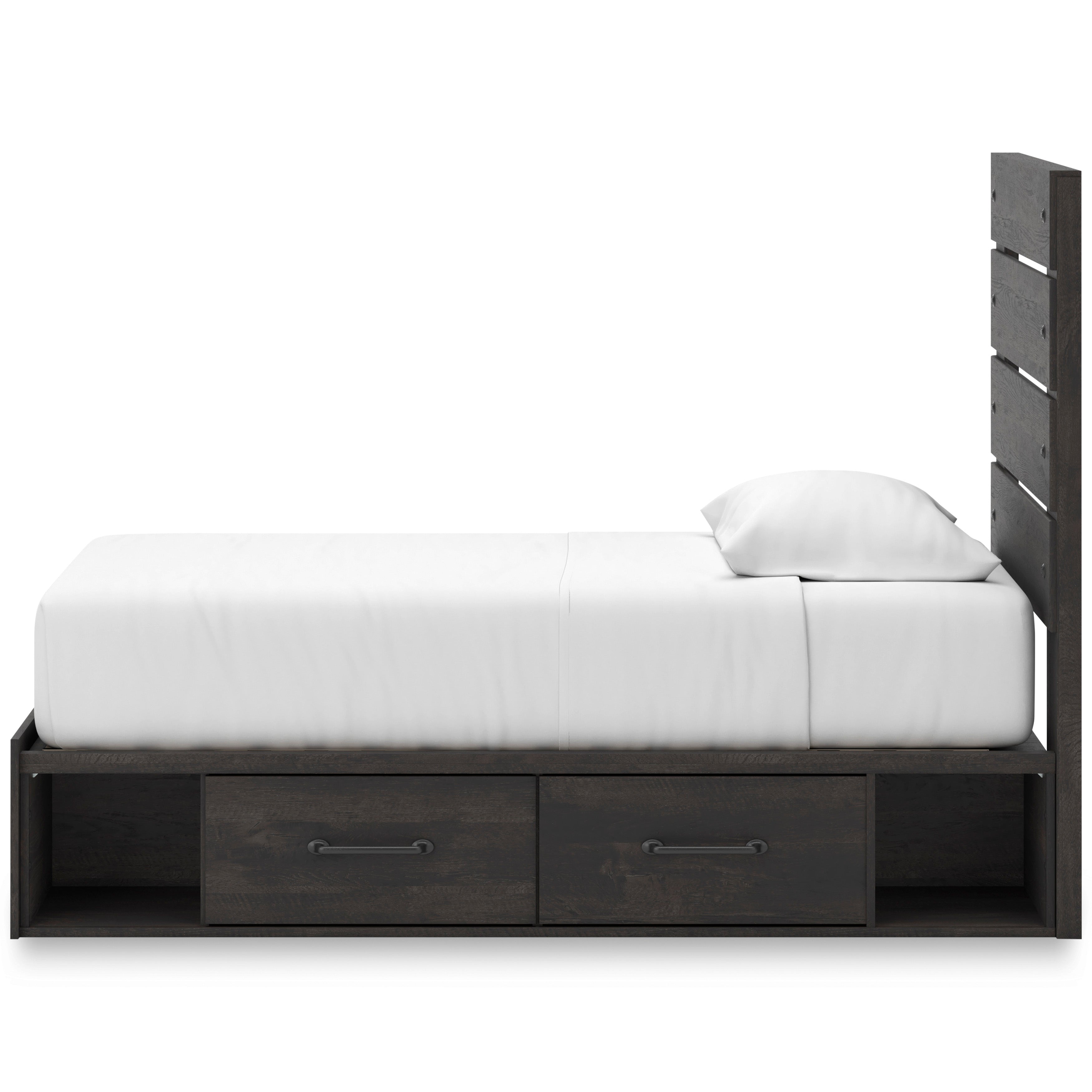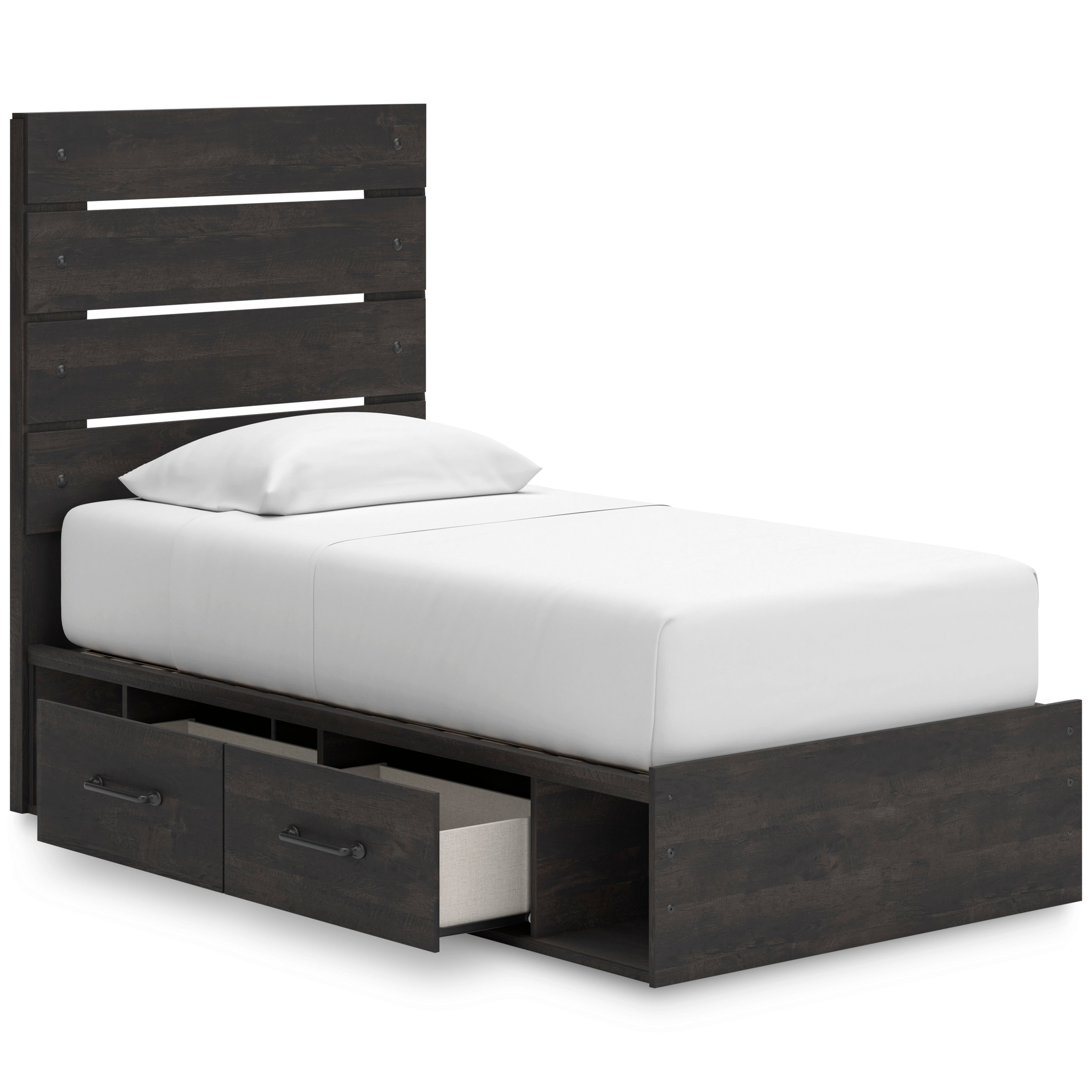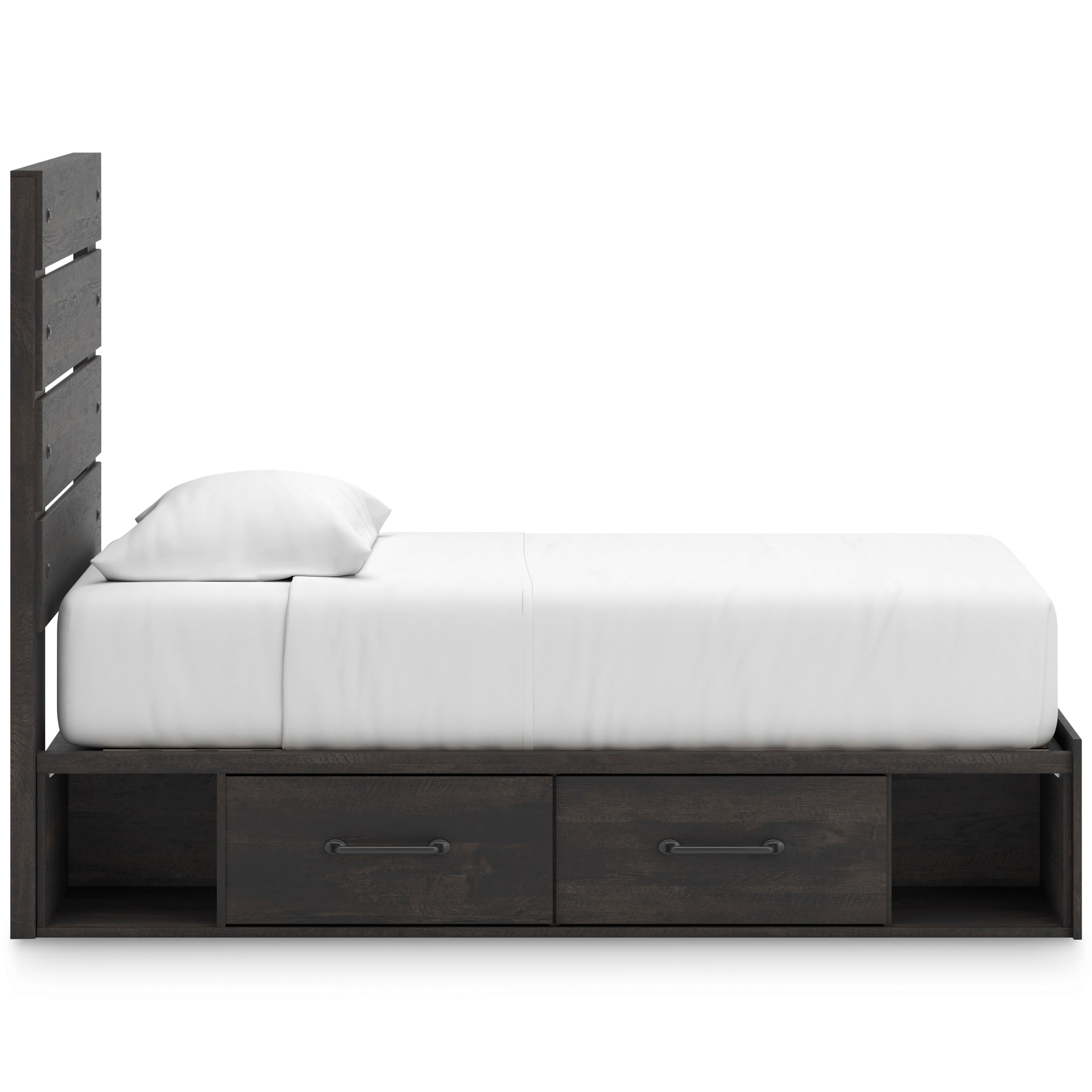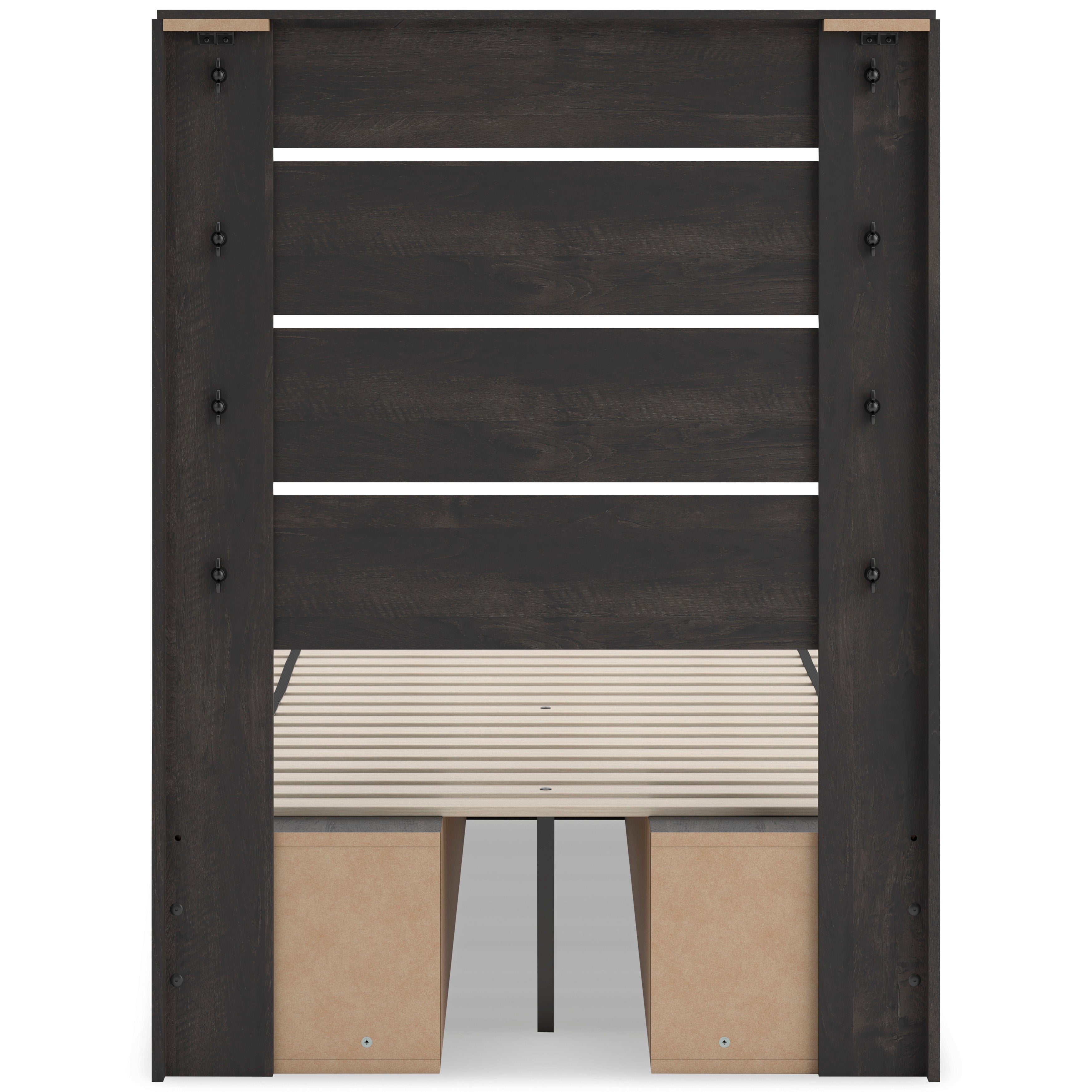 Update your bedroom with this Panel Storage Bed, available in Twin and Full sizes, designed to deliver casual contemporary style with smart everyday functionality. The rustic charcoal oak-look finish pairs easily with neutral tones or bold accents, while the built-in underbed storage keeps clutter neatly out of sight. Featuring four smooth-gliding drawers and four open storage cubbies, this panel bed with storage maximizes organization without taking up extra floor space. Crafted from engineered wood with durable decorative laminate, it includes roll slats, does not require a box spring, and works with most zero-clearance adjustable bases. Complete the look with the optional 5-piece bedroom set, which includes the Panel Storage Bed, a roomy Dresser for clothing storage, a matching Mirror to brighten the space, a practical Nightstand for bedside essentials, and a coordinating Chest for added organization, creating a cohesive and storage-forward bedroom with modern appeal.