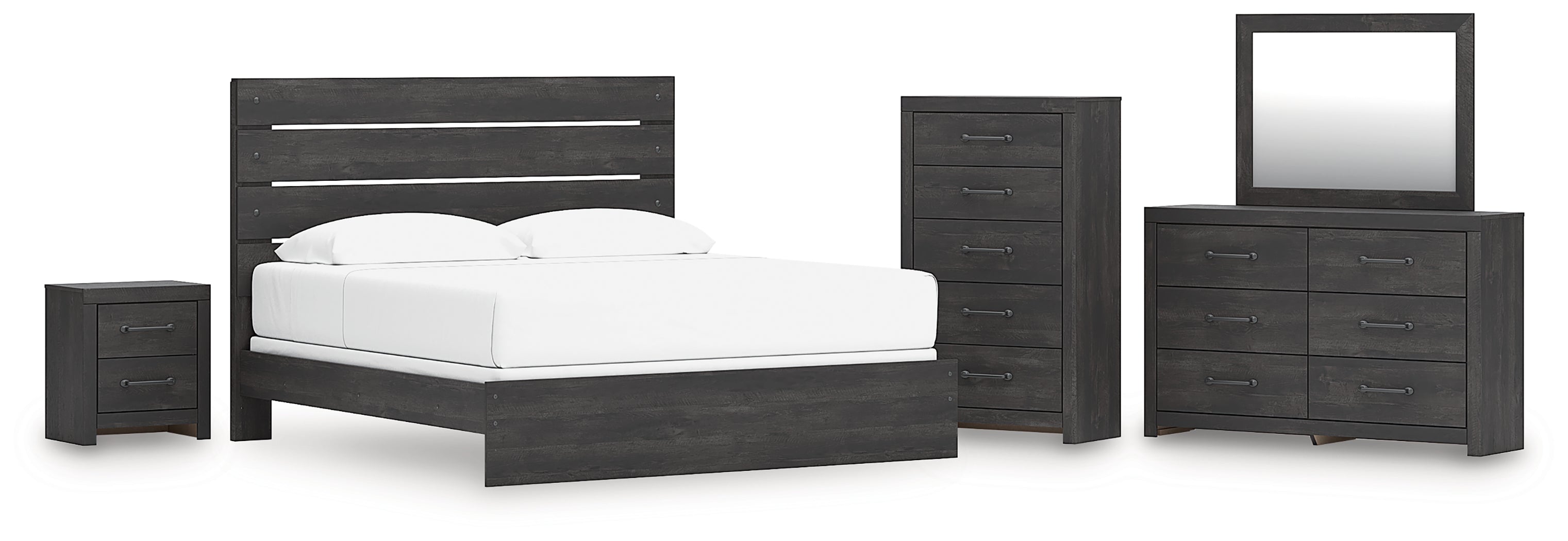 Hollivern King Panel Bed with Mirrored Dresser, Chest and Nightstand in Dark Gray