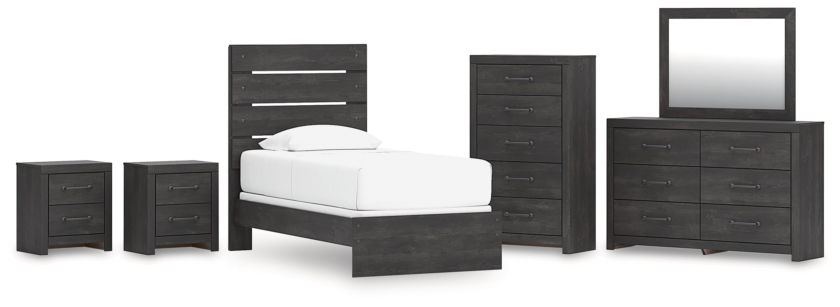 Hollivern Twin Panel Bed with Mirrored Dresser, Chest and 2 Nightstands in Dark Gray