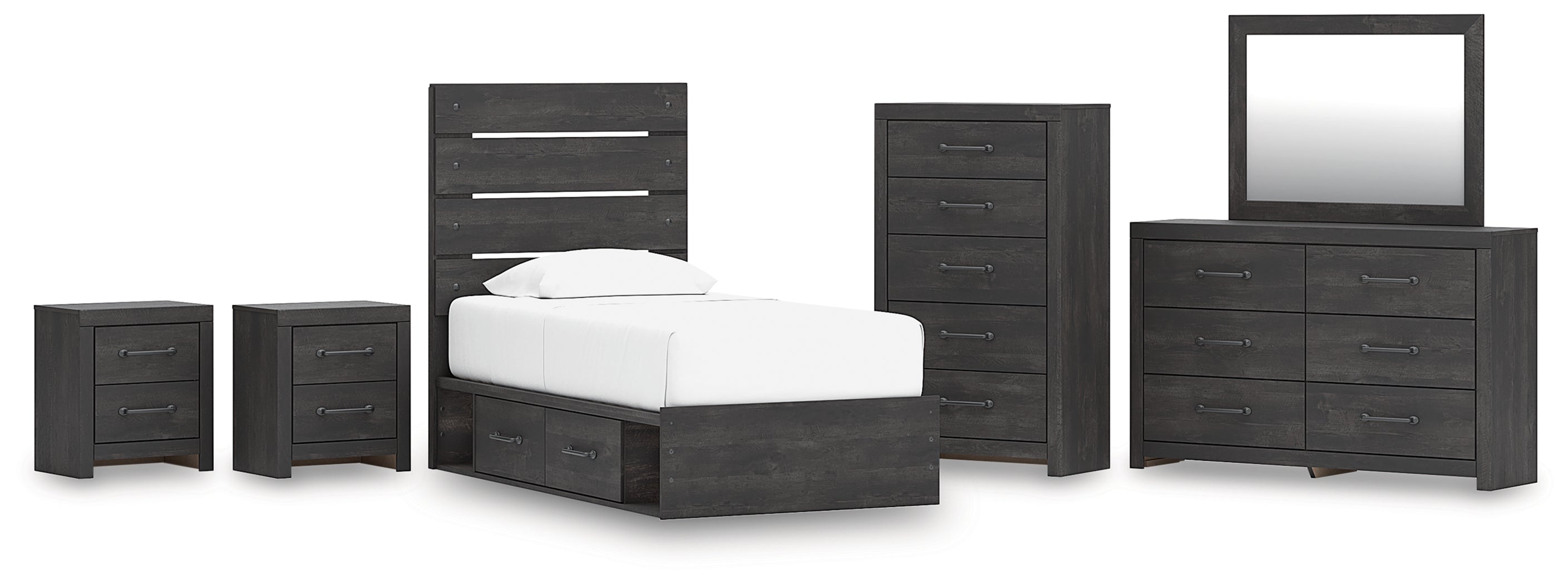 Hollivern Twin Panel Bed with Storage with Mirrored Dresser, Chest and 2 Nightstands in Dark Gray
