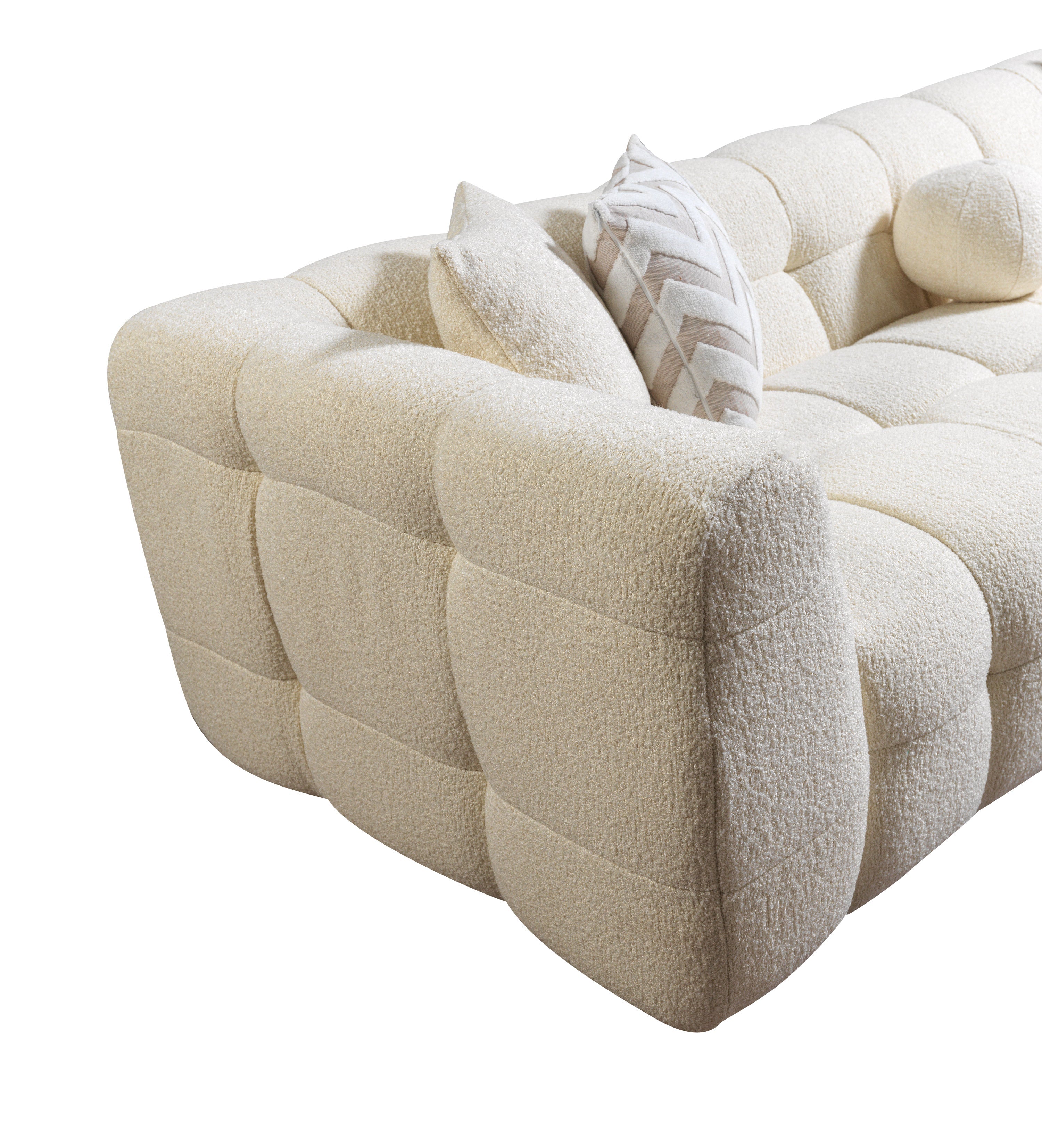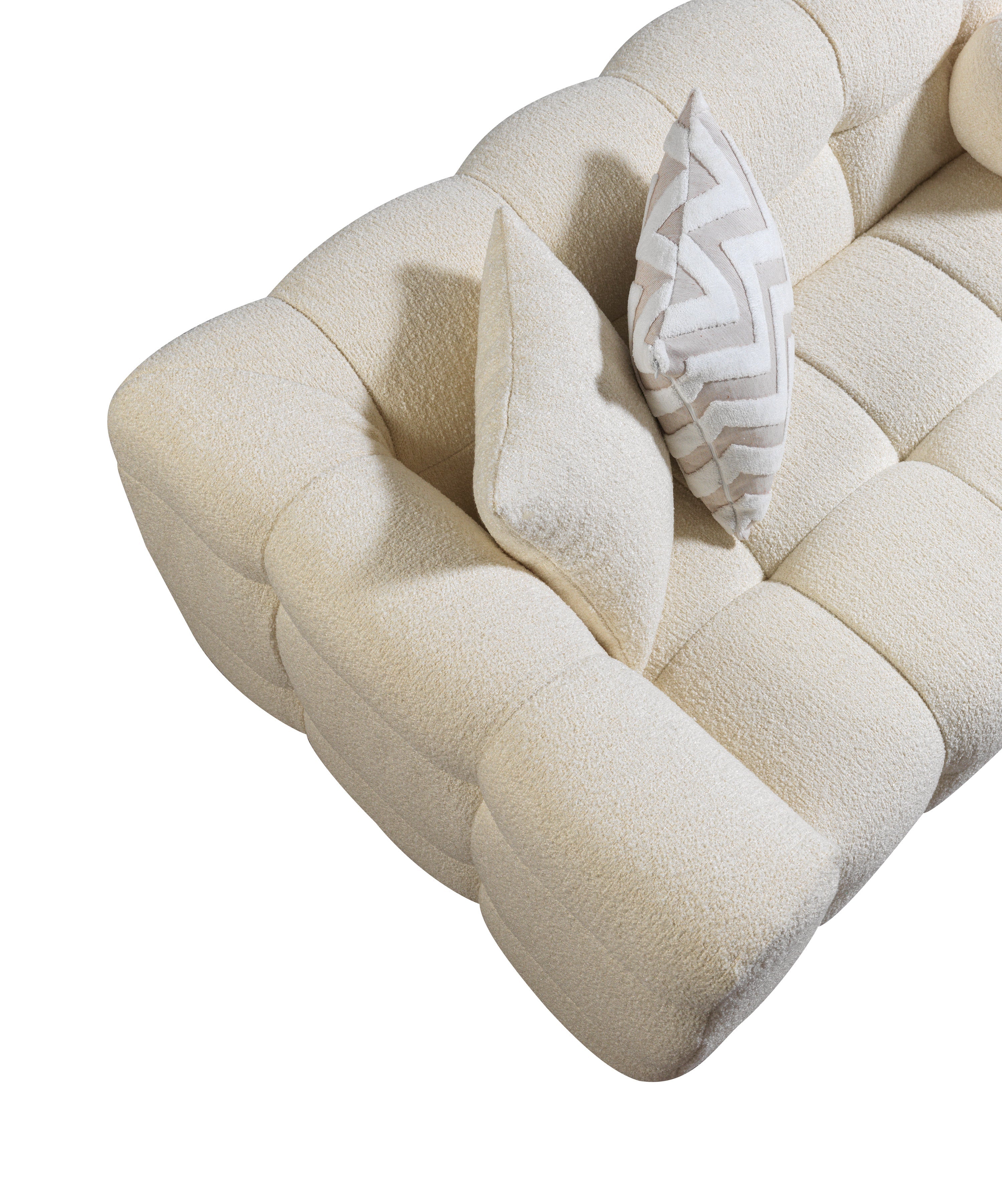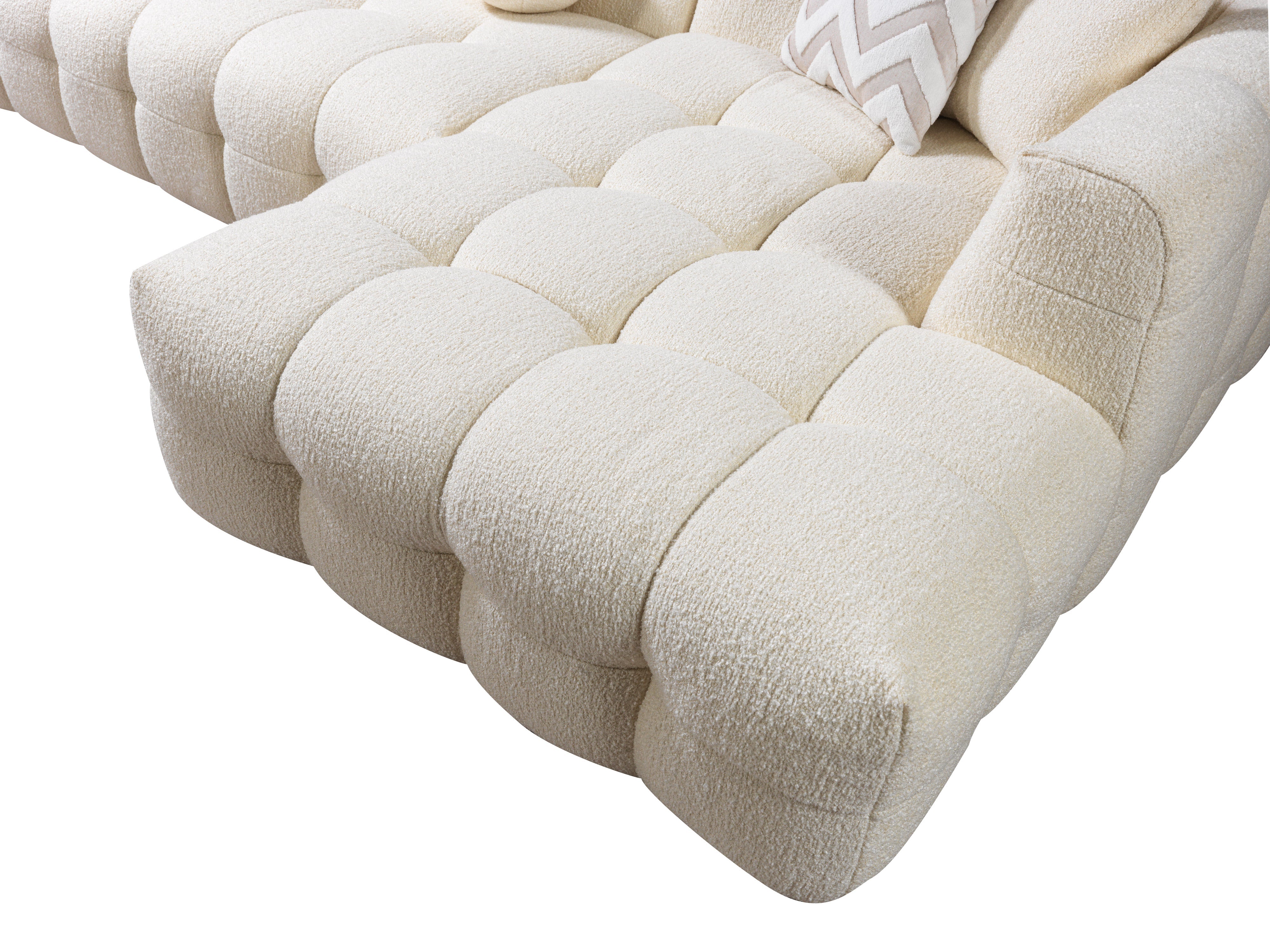 Step into a world of refined elegance and contemporary comfort with the Ivy Ivory Boucle RAF Sectional—a sectional sofa designed to be the focal point of your modern living room. Imagine hosting friends for a cozy movie night, lounging with your favorite book on a lazy Sunday afternoon, or catching up with family for lively conversations—all while relaxing in plush, cloud-like comfort. The Ivy Ivory Boucle Sectional is upholstered in sumptuous boucle fabric, renowned for its soft, tactile texture and on-trend appeal. Its neutral ivory color harmonizes beautifully with any palette, and the geometric tufted design creates a visually stunning centerpiece that effortlessly adapts to minimalist, urban, and transitional interiors. A generously-sized right-arm-facing chaise offers unrivaled lounging space, while the floating hidden base and structured track arms keep the look clean and dynamic. Whether placed in a sun-filled loft, a serene family den, or a chic penthouse, this sectional transforms daily living into an experience of luxury and tranquility. Luna Furniture introduces Ivy Ivory Boucle RAF Sectional to enhance the beauty of your living spaces. Luna Furniture.