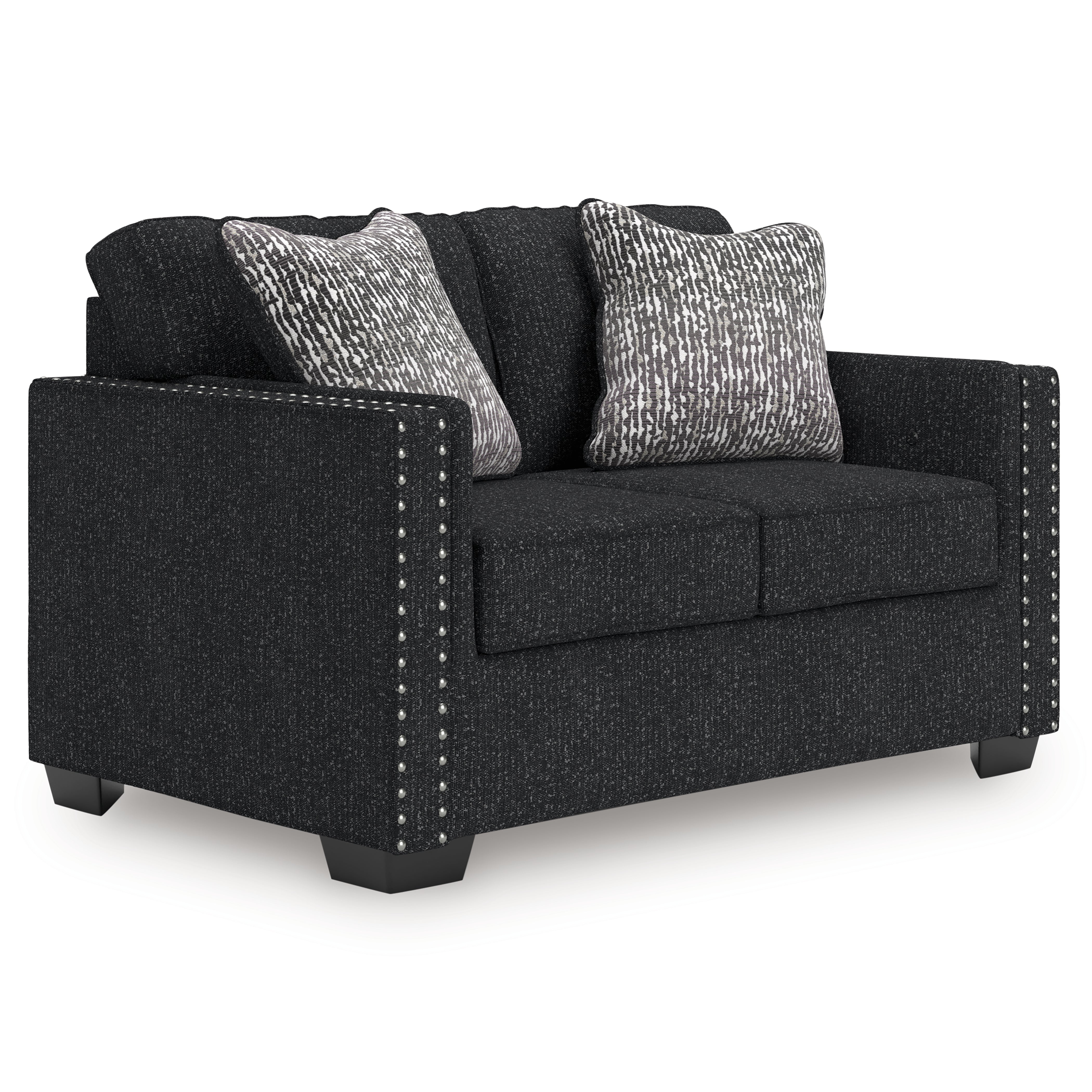 This stunning loveseat leaves a lasting impression. Its cozy cushions, chic coal-colored upholstery and striking nailhead trim are a perfect blend of comfort and contemporary design. And here’s the showstopper—ambient red, white and blue LED lighting along the loveseat's base. The look is simply wow.