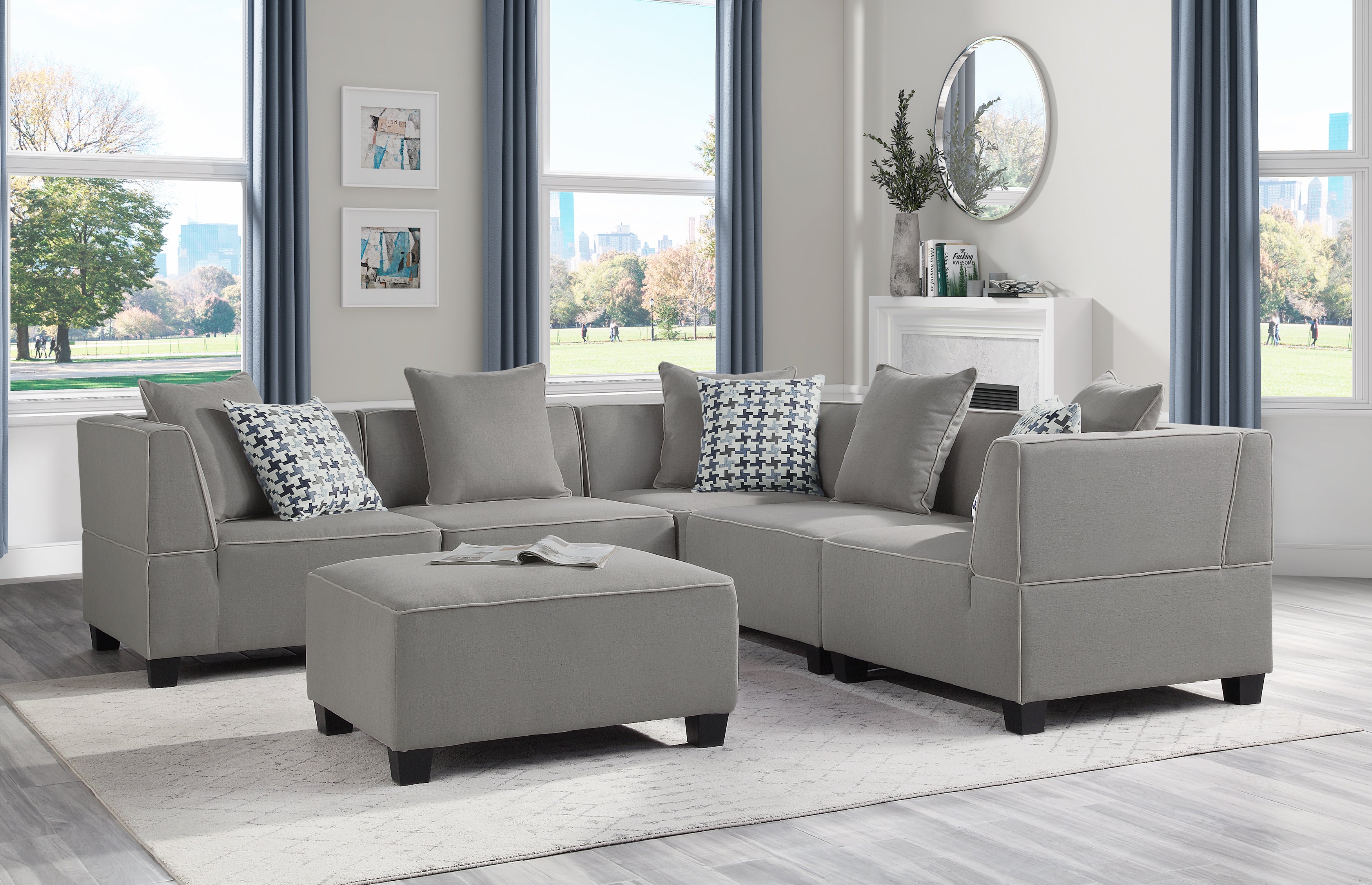The modular design of the Jayne Collection provides a versatile seating experience configurable to your modern living room’s available space. The rectangular ottoman features gray textured fabric and profile-defining contrast welt.
