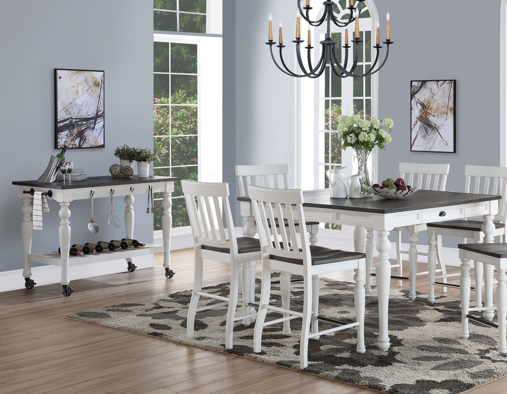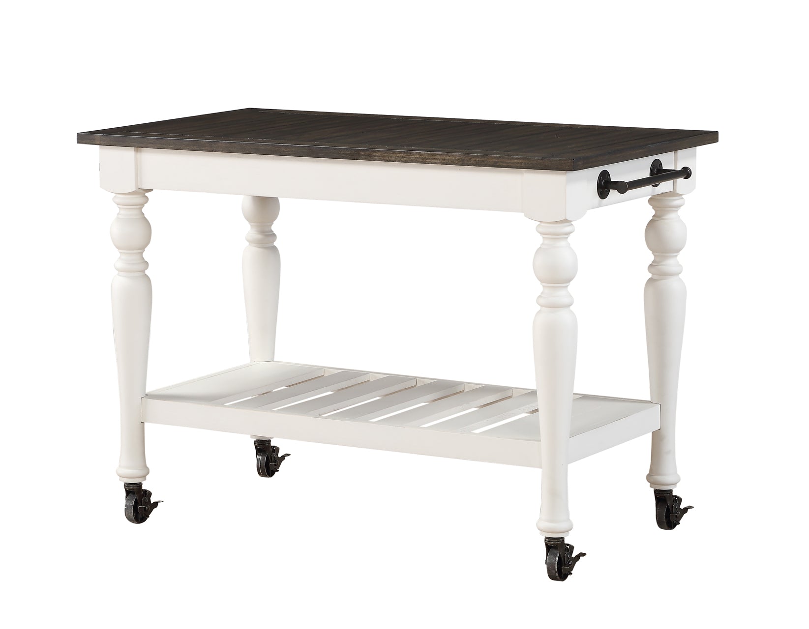 Classic farmhouse styling updated for today’s dining. Turned legs and pilasters combine with cup pulls to create a look that is both new and vintage. The Joanna Server Cart is both stylish and functional with hooks for hanging, handles for towels and for use as a push bar and slatted bottom shelf for additional storage. A two-tone ivory and mocha finish complements many decors