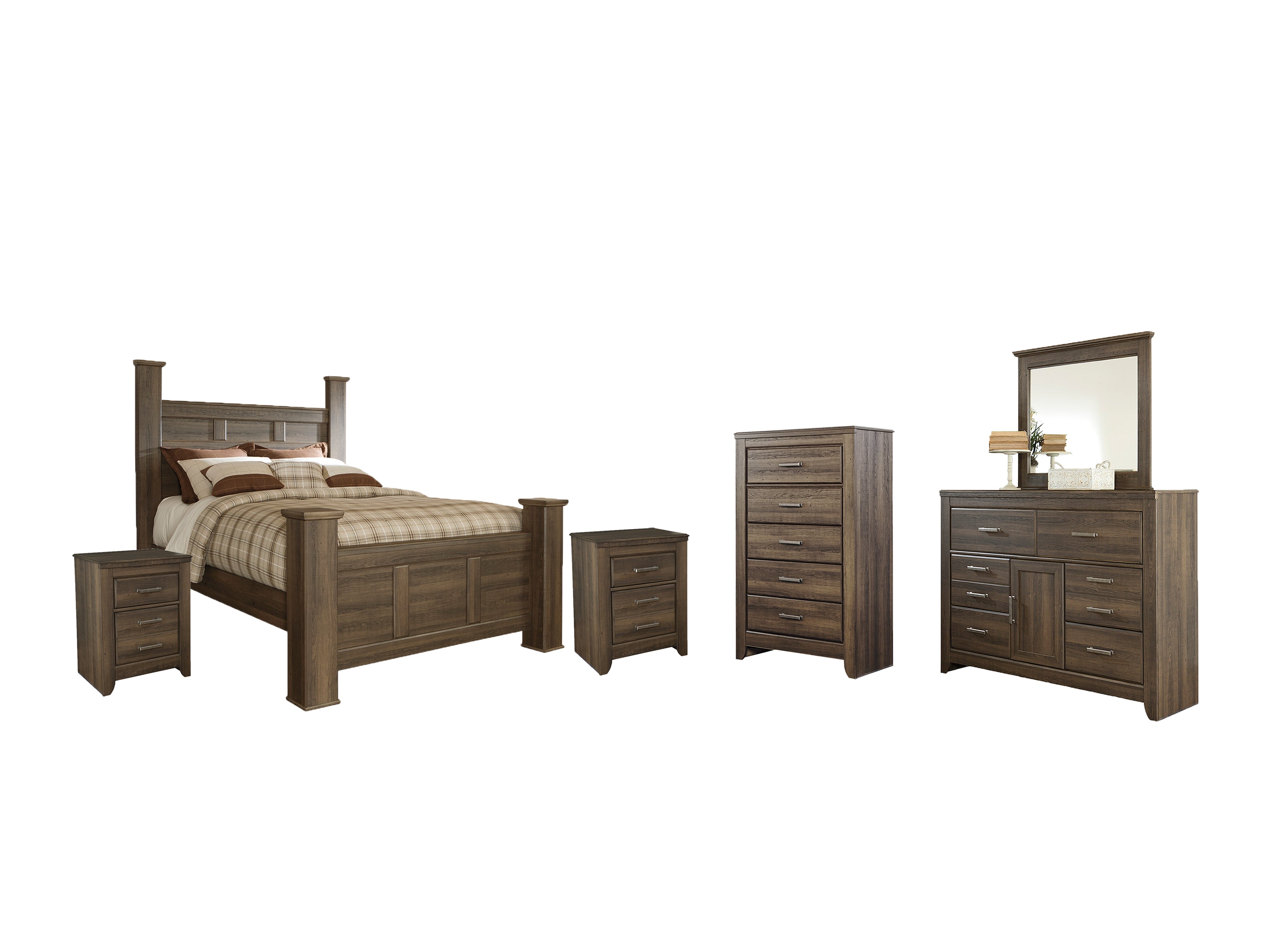 Juararo Queen Poster Bed with Mirrored Dresser, Chest and 2 Nightstands in Dark Brown