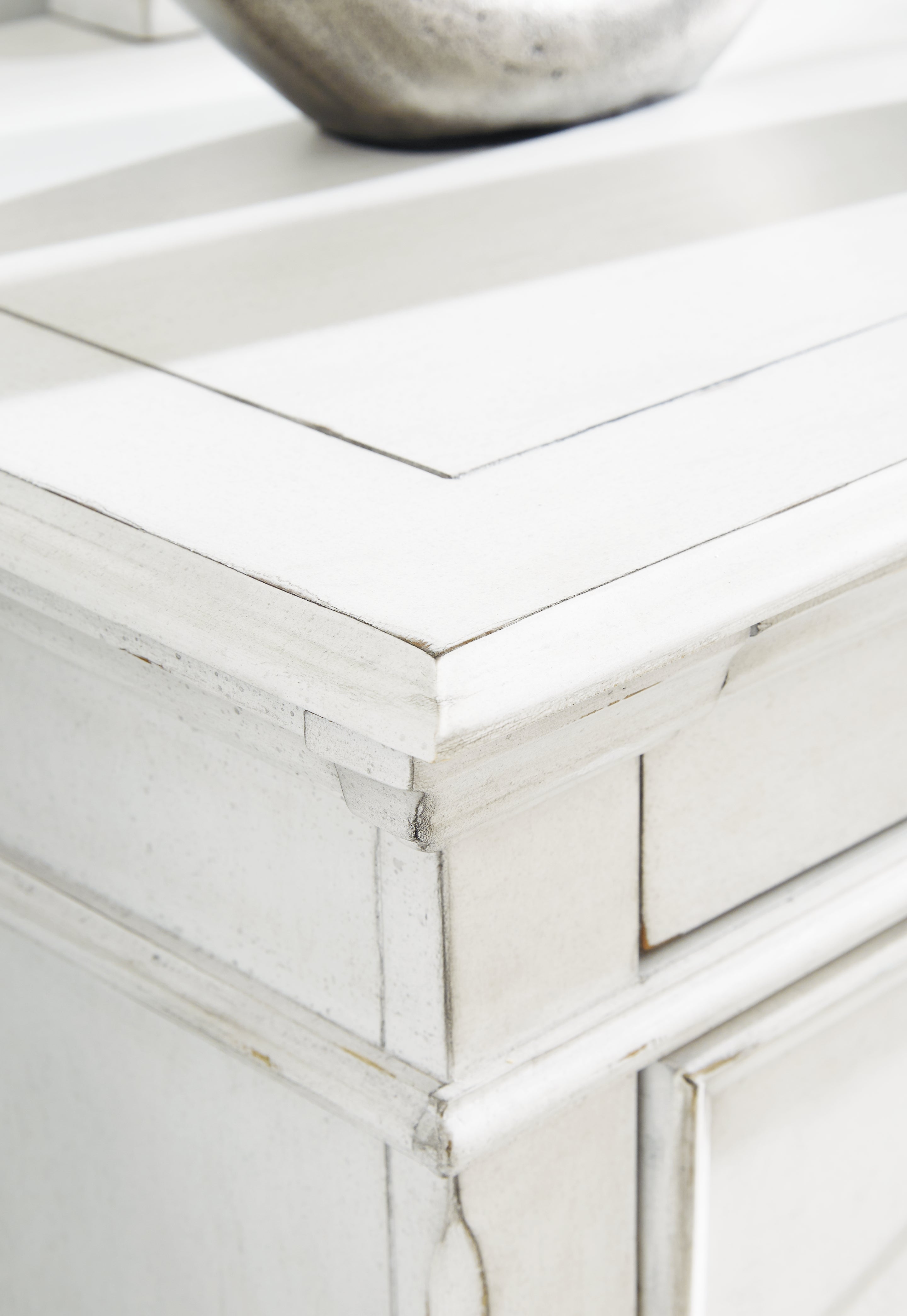 Give your retreat vintage charm and valuable drawer storage with this dresser and mirror set. In a beautifully distressed whitewash finish, you'll love putting it all away in casual style. Seven full-sized drawers and two accessory top drawers will easily accommodate your needs. Its beveled mirror brings magnificent height to this piece. Generously scaled moulding from top to bottom, along with bun feet and drawer handles with a transitional aesthetic, give this dresser and mirror character—evoking the feel of a quaint cottage escape. Luna Furniture introduces Kanwyn Dresser and Mirror to enhance the beauty of your living spaces.