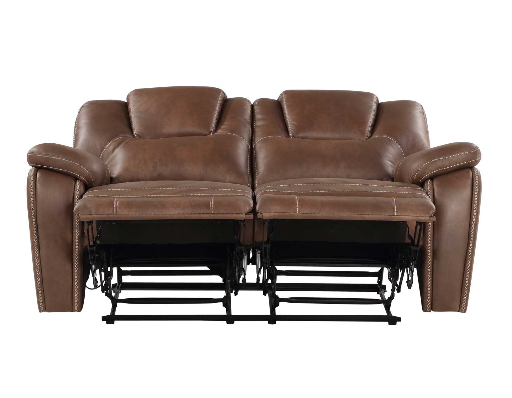 The Katrine Loveseat showcases the best in manual motion upholstery with this dual reclining ensemble. This Loveseat is covered in a luxurious chestnut brown faux-leather that features baseball stitching for an extra special touch. The padded armrests add to the comfort of the Loveseat while the raised, padded headrest enables a comfortable view even when fully reclined.