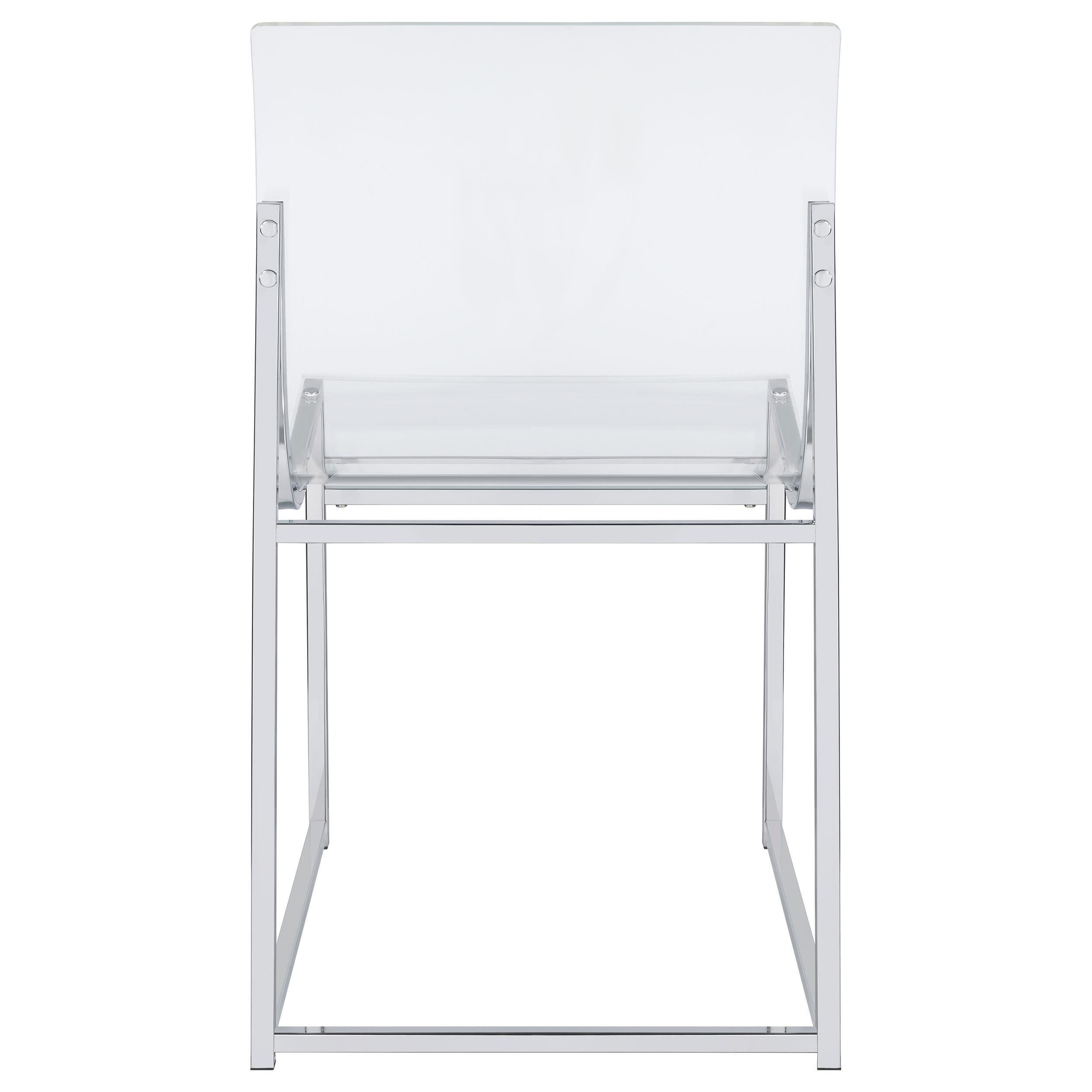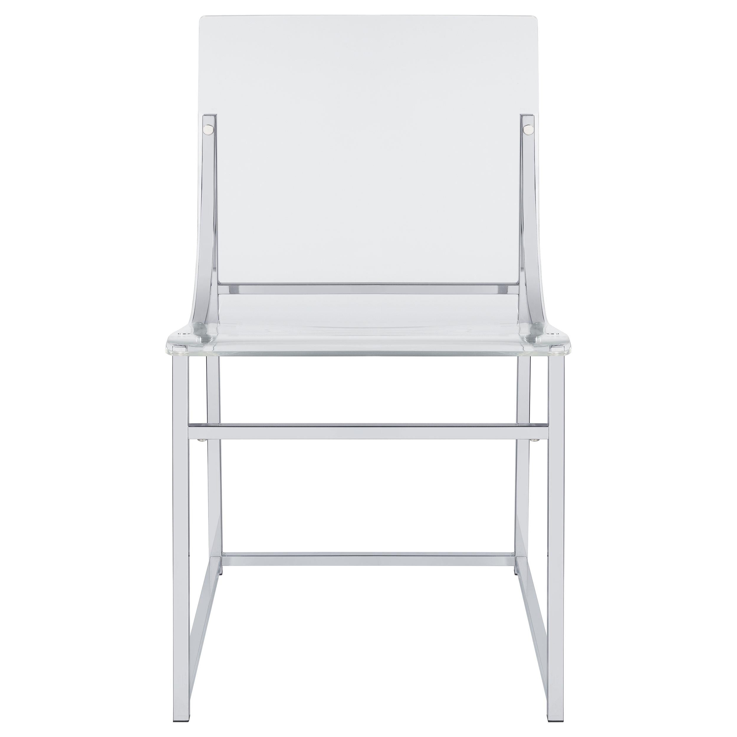 Elevate your dining experience with this chic, contemporary dining set, where modern design meets airy elegance. This set includes a stunning round glass-top table with clear acrylic legs that create a sleek, sculptural profile, complemented by gleaming chrome accents for a touch of sophistication. Four side chairs with clear acrylic seats and backs complete the set, adding a minimalist yet comfortable touch to your space. The sled-inspired chrome bases of the chairs provide stability and a dynamic contrast to the graceful curves of the acrylic, making this set an eye-catching centerpiece for any modern dining room or breakfast nook. Perfectly suited for compact spaces, this set combines style and functionality, offering a light and open feel that effortlessly enhances any decor.