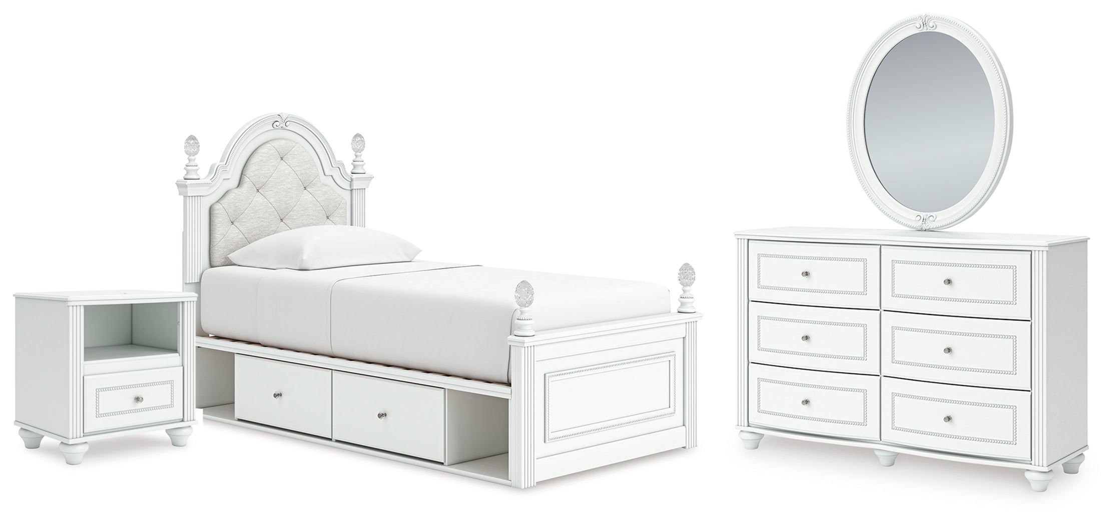 Kozlani Twin Upholstered Panel Storage Bed with Mirrored Dresser and Nightstand in White