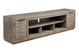 This extra-large TV stand is sure to win your heart with its daring take on modern rustic expression. Its crisp, clean minimalist-chic profile is enriched with striking pine wood grain and a weathered gray finish with distressed saw mark texture. Designed to turn your home theatre room into a style statement, the large center media cabinet can be removed for use with the optional W100-22 electric fireplace (sold separately). — Luna Furniture introduces Krystanza 92" TV Stand to enhance the beauty of your living spaces.